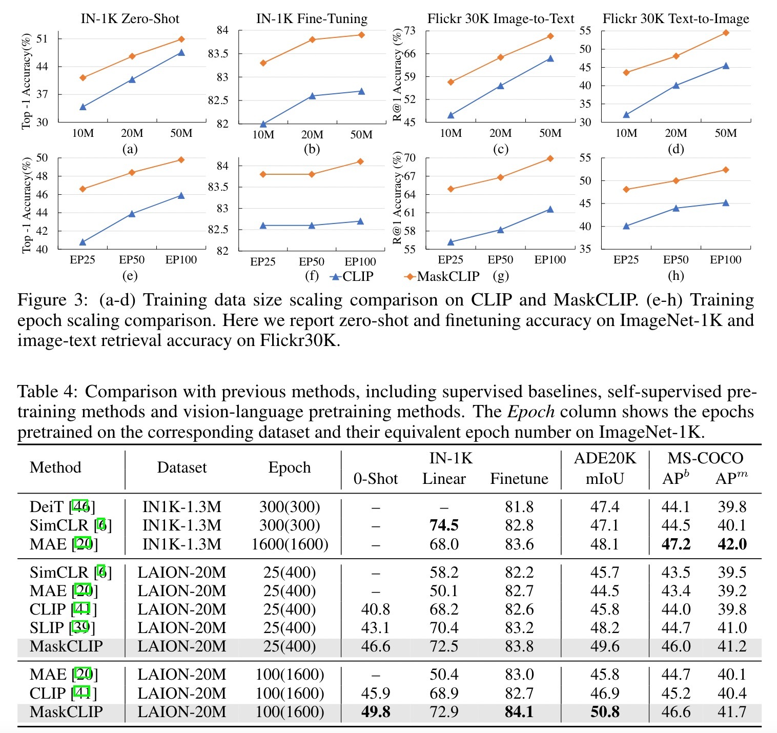 为了显示MaskCLIP作为一种通用视觉先进方法的有效性,我们对视觉任务进行实验。对于视觉任务,我们报告了Imagenet-1K分类,MS-COCO对象检测和ADE20K 语义分割的结果。对于视觉-语言任务,我们在25个数据集上报告了零样本结果,并在Flickr30K 和MS-COCO上报告了图像文本检索结果。在下文中,我们将监督基线DeiT [46],自监督方法SimCLR 和MAE 以及视觉-语言方法CLIP和SLIP进行比较。为了进行公平的比较,我们在LAION-20M上以相同的时代训练SimCLR和MAE。