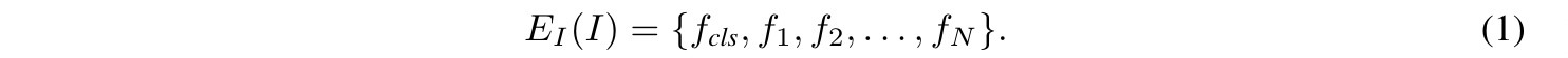 我们介绍了MaskCLIP,这是一个学习视觉表示的新颖框架。 MaskCLIP的核心部分是其骨干图像编码器,如图1所示,由EI表示。它在预处理过程中获得了可转移能力,可以使下游视觉任务受益。在最近的自我监督方法之后,我们将骨干\( E_I \)设定为视觉Transformer(ViT)。 \( E_I \)给定的输入图像I的预测结果,然后应该是视觉特征令牌的集合,表示为: