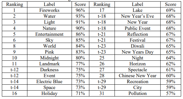 然而,当试图只给整个图像贴上标签而不是搜索特定的物体时,Vision AI明显改善了其预测结果。这些结果,即排名、标签和分数,都显示在表1-1中。开头用 "t-"表示的排名代表得分相同。在排名的顶部,这些标签似乎适合于该图像,特别是 "烟花 "以96%的分数出现在顶部。有几个标签激起了人们对该算法如何工作的好奇心。尽管 "地标 "和 "空间 "的得分是77%,但如果从图像的表面价值来看,它们是不准确的。有几个标签似乎很难被普遍可视化,如 "午夜"、"事件 "和 "假日"。最后,有些标签可能是准确的,也可能是不准确的,这取决于标签的使用环境(例如,同音字,如 "光 "的亮度或重量,这两个词在这里都很合适),以及图片的拍摄环境(例如,"除夕"、"排灯 "和 "中国新年")。
