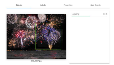Vision AI包括Vision API,可以对图像中的各种物体/特征进行分类、识别和检测(Google, 2021)。使用他们的工具的网络演示,图1-2.a所示的同一图像被通过,并在两种不同的情况下被评估,物体识别和图像标签。Vision AI只对物体进行识别,图1-3中的绿框表示的是闪电,得分是51%(其中 "得分 "是一个从无信心,0%到高信心,100%的值(Google, 2021))。