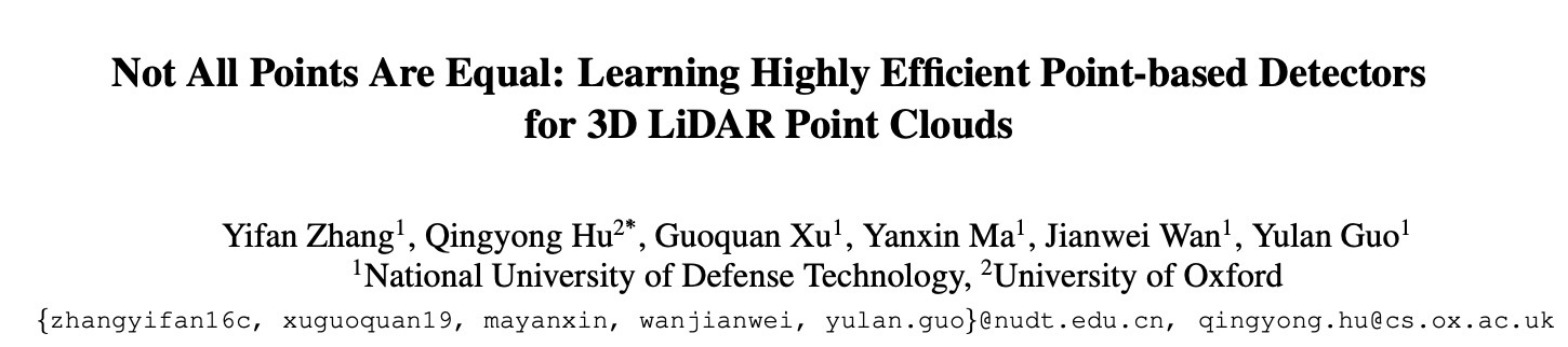 虽然这些方法很不错,并且没有任何显式信息丢失,但仍然存在昂贵的计算/内存成本和有限的检测性能。本文首先深入研究了现有的基于point的框架,并在实验中发现,所使用的启发式采样策略远远不能令人满意,因为许多重要的前景点在最终的边界框回归步骤之前被丢弃。因此,检测性能,特别是对行人等小目标的检测性能从根本上受到限制。论文认为并非所有点对目标检测任务都同等重要,使用角度出发,只有前景点,才是真正需要关心的。