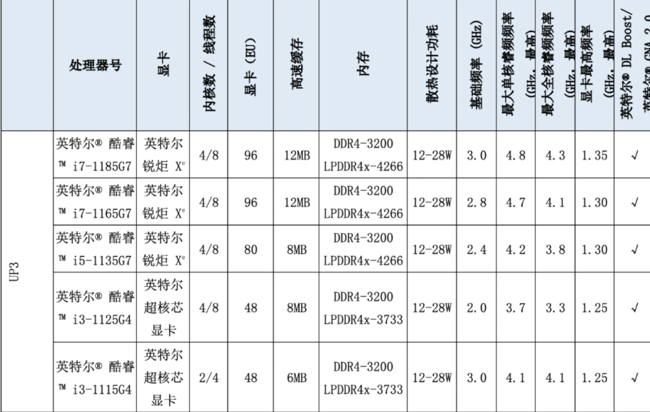 今年 8 月,英特尔罕见地开了一场充满干货的「架构日」活动,透露了即将发布的 Tiger Lake 处理器的部分信息。今天,这些产品宣告开售,在新一代酷睿 CPU 中,英特尔提供了更快的速度、更强大的 AI 处理能力。今年底即将推出的笔记本,想必性能会提升不少。英特尔先推出了两种类型的 Tiger Lake 芯片,功率从 7W 到 28W。下图为 Tiger Lake 的 UP3 部分的处理器细节: