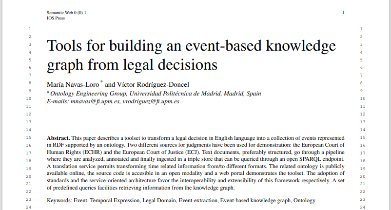 本文描述了一个工具集,将英语的法律判决转化为由本体支持的RDF表示的事件集合。两个不同的判决来源被用来演示:欧洲人权法院(ECHR)和欧洲法院(ECJ)。文本文件,尤其是结构化的,经过一个管道,被分析、注释,最后被转化为一个三元组存储,可以通过一个开放的SPARQL端点进行查询。转化服务允许将与时间相关的信息从不同的格式转换过来。相关的本体论在网上是公开的,源代码可以以开放的方式获得,一个门户网站展示了该工具集。标准的采用和面向服务的架构分别有利于该框架的互操作性和可扩展性。一套预定义的查询工具可以从知识图谱中检索到信息。