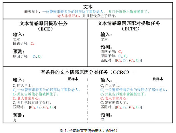近年来,情感分析问题受到人们的广泛关注,相关的任务和数据集层出不穷。相较于其他情感分析任务,文本情感原因匹配聚焦于情感溯因,为学者们提供了一个崭新的探索角度。文本情感原因匹配可以分为词级别、子句级别和跨度级别三种任务,本文将围绕子句级别的文本情感原因匹配任务展开。在子句级文本情感原因匹配任务中,先后提出了文本情感原因提取任务、文本情感原因匹配对提取任务和有条件的文本情感原因分类任务(如图1所示)。本文针对文本情感原因匹配任务提出了新的算法。