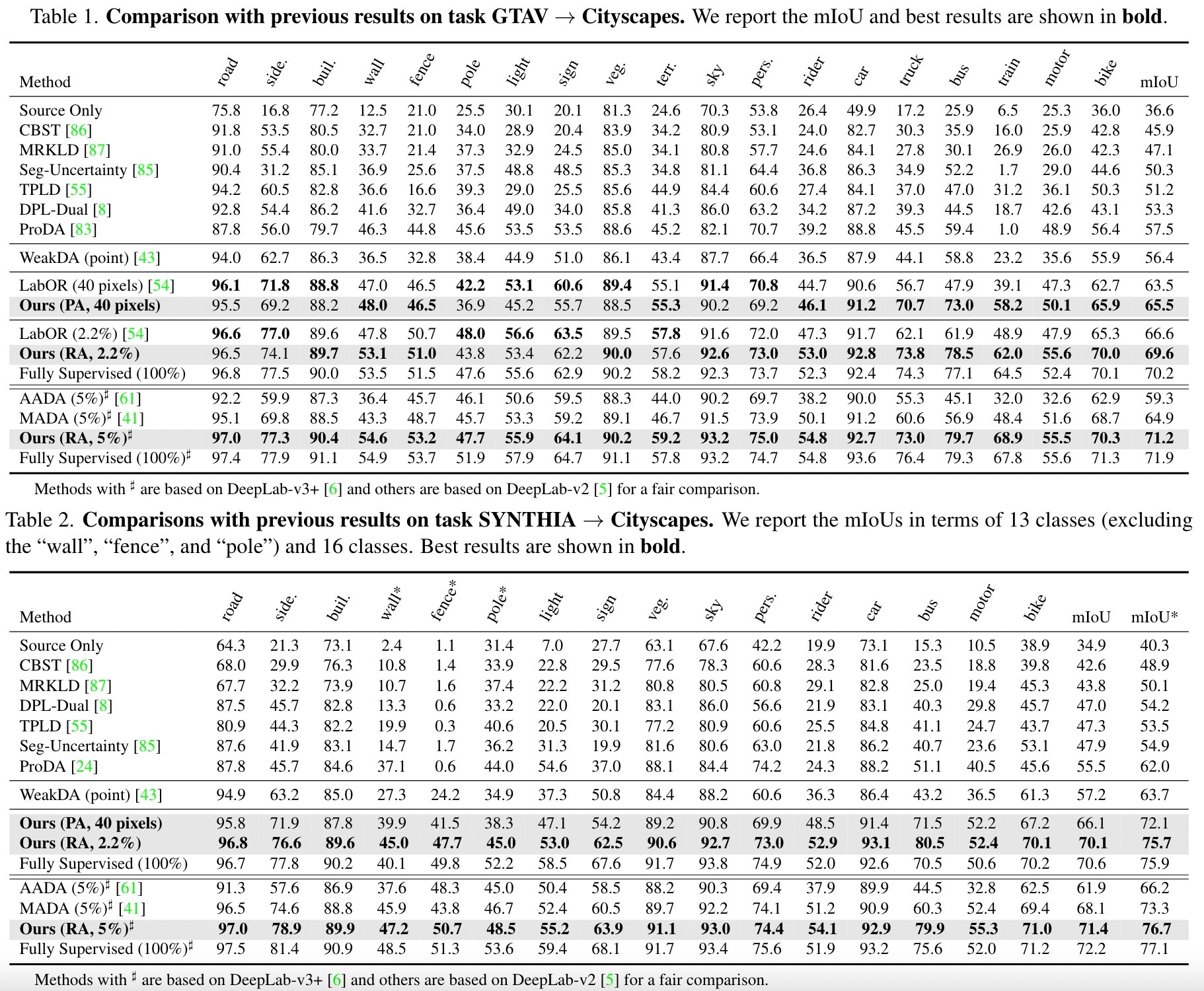 GTAV→CityScapes和Synthia→CityScapes的结果分别显示在表1和表2中。可以看出,我们的方法显着优于先前领先的自我训练方法。即使我们每个目标图像只使用40个像素,我们的(PA)也对先前的破坏记录方法(即Proda)显示出实质性的改进,这意味着主动学习是针对域适应的有前途和互补的解决方案。
