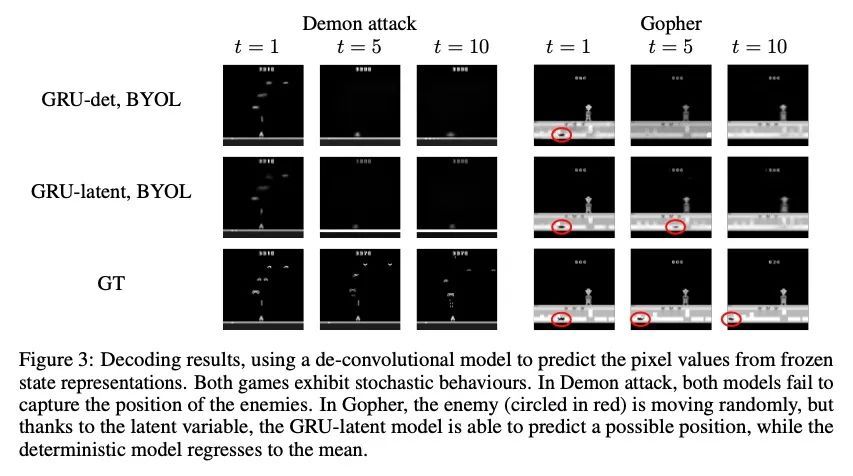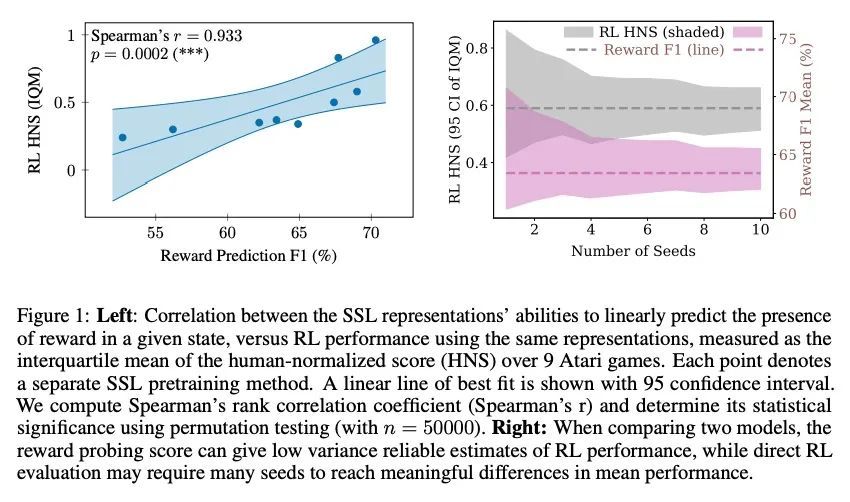 强化学习无监督表示的轻量探测。无监督视觉表示学习提供了一个机会,可以利用大型的无标签轨迹体来形成有用的视觉表示,可有利于强化学习(RL)算法的训练。然而,评估这种表示的适用性需要训练强化学习算法,这在计算上是很稠密的,而且结果差异很大。为缓解该问题,本文设计了一种无监督强化学习表示的评估协议,其方差较低,计算成本降低了600倍。受视觉界启发,本文提出了两种线性探测任务:预测在特定状态下观察到的奖励,以及预测专家在特定状态下的行动。这两个任务普遍适用于许多强化学习领域,本文通过严格的实验表明,它们与Atari100k基准上的实际下游控制性能密切相关。这为探索预训练算法空间提供了一种更好的方法,而不需要为每一种设置运行强化学习评估。利用该框架,本文进一步改进了现有的自监督学习(SSL)强化学习的方案,强调了前向模型的重要性,视觉骨干的大小,以及无监督目标的精确表述。