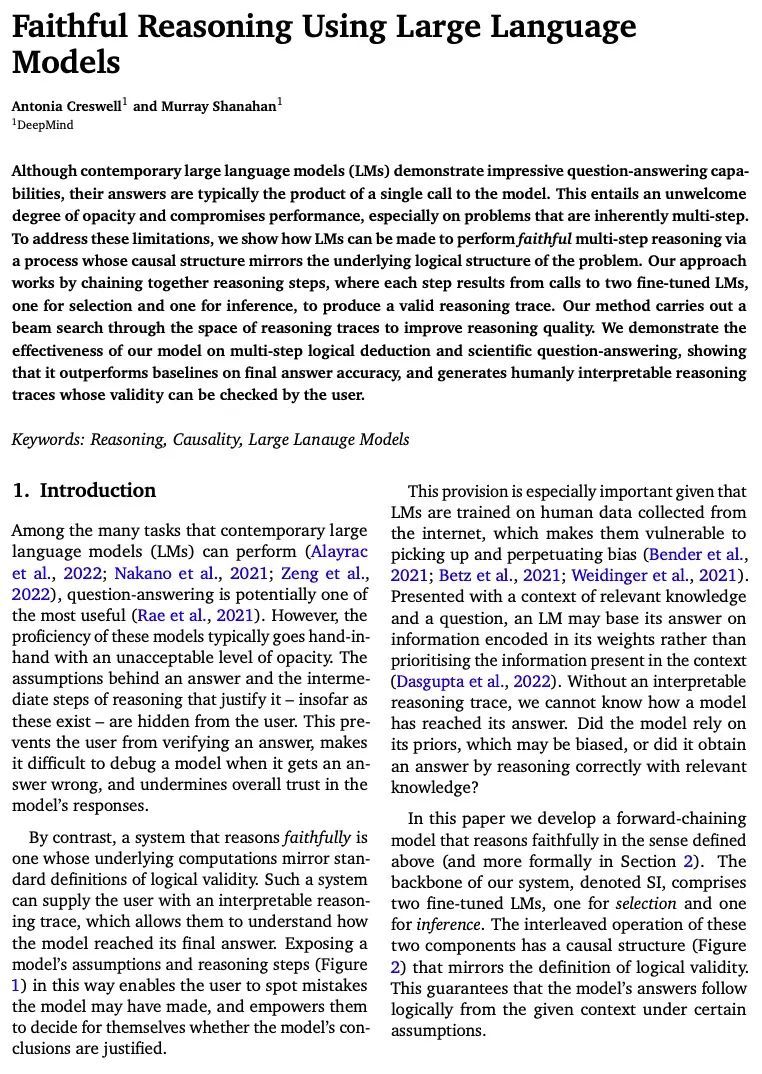 基于大型语言模型的事实推理。尽管当代大型语言模型(LM)展示了令人印象深刻的问题回答能力,但它们的答案通常是对模型的单一调用的产物。这带来了不受欢迎的不透明性,并影响了性能,特别是在固有的多步的问题上。为解决这些限制,本文展示了如何使LM通过一种因果结构反映问题的基本逻辑结构过程来进行忠实的多步推理。将推理步骤串联起来,每一步都调用两个微调的语言模型,一个用于选择,一个用于推理,以产生有效的推理轨迹。所提出的方法通过推理轨迹空间进行波束搜索,以提高推理质量。实验证明了该模型在多步逻辑推理和科学问答上的有效性,表明它在最终答案的准确性上优于基线,并且产生了人类可解释的推理轨迹,其有效性可由用户进行审查。