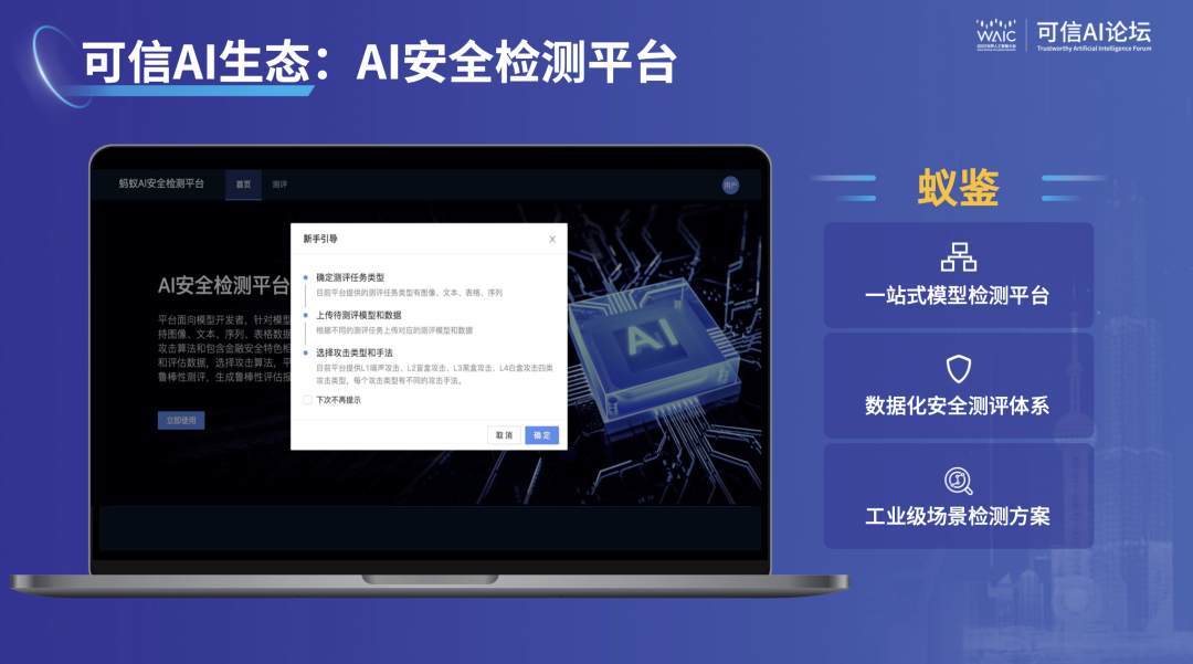 开放平台对于生态建设也至关重要。比如今天蚂蚁发布的AI安全检测平台“蚁鉴”,它面向所有AI模型开发者,提供从模型对抗测试到防御加固的一站式测评解决方案,覆盖文本、图像、表格、序列等不同数据类型,相当于是蚂蚁把自身认为在工业界比较有用的鲁棒性技术,比如怎么做和怎么分级、怎么去检测和优化,做成一个技术开放给生态,让大家作为参考,也可以直接用。我们后续也会把隐私、公平、可解释放进平台里,在大家使用的过程当中,可以逐渐去对齐一些标准。