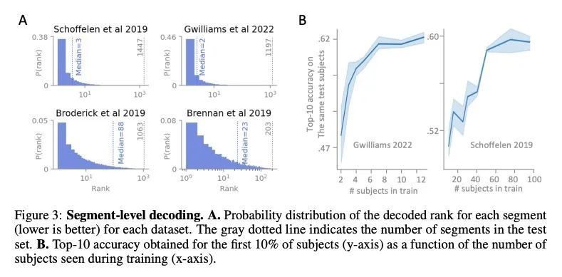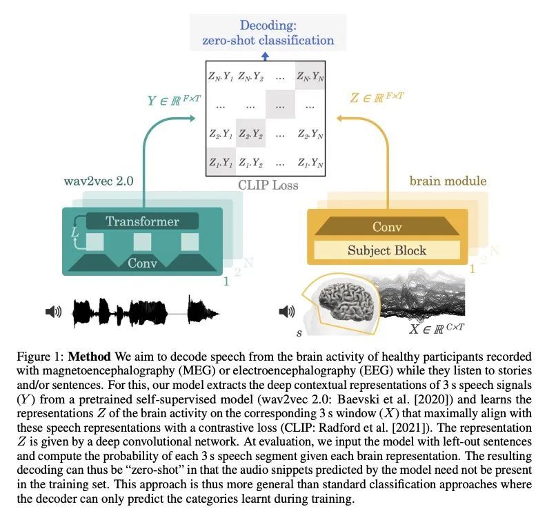 从非侵入性脑记录中解码语言。从大脑活动中解码语言,是医疗保健和神经科学中一个期待已久的目标。由于颅内设备的出现,最近已经达到了重要的里程碑:针对特定对象的管道,通过对基本语言任务的侵入性大脑反应进行训练,现在开始有效地解码可解释的特征(如字母、单词、频谱图)。然而,将这种方法扩展到自然语音和非侵入性的大脑记录仍然是一个重大挑战。本文提出一种单一的端到端架构,用对比学习的方式在大量的个体群中进行训练,以预测自然语音的自监督表示。本文在四个公共数据集上评估了提出的模型,包括169名志愿者在听自然语音时用磁电脑图(M/EEG)记录的数据。结果显示,提出的模型可以从3秒的脑电信号中识别出相应的语音片段,在1,594个不同的片段中,top-10准确率高达72.5%(top-1准确率高达44%),在2,604个EEG记录中,准确率高达19.1%,因此可以对训练集中没有的短语进行解码。模型比较和消融分析表明,这些表现直接受益于最初的设计选择,即使用(i)对比性目标,(ii)预训练语音表示和(iii)在几个参与者中同时训练的共同卷积架构。这些结果共同划定了一条有希望的道路,从非侵入性的脑活动记录中实时解码自然语言处理。