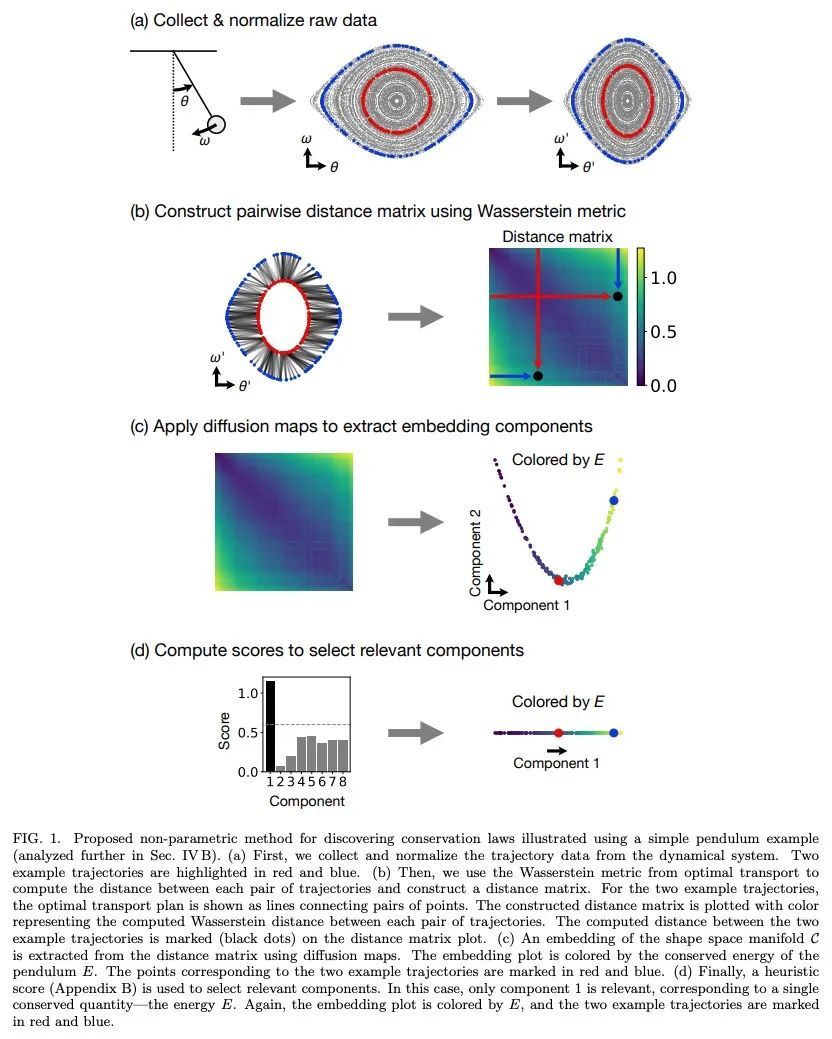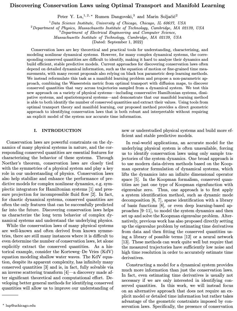 利用最优传输和流行学习发现守恒定律。守恒定律是理解、描述和模拟非线性动态系统的关键理论和实践工具。然而,对于许多复杂的动力系统来说,相应的守恒量是很难识别的,因此很难分析它们的动力学并建立高效、稳定的预测模型。目前发现守恒定律的方法往往依赖于详细的动力学信息,如运动方程或细粒度的时间测量,最近的许多建议也依赖于黑箱参数化的深度学习方法。本文将这一任务重新表述为流形学习问题,并提出了一种非参数化的方法,将最优运输中的Wasserstein度量与扩散图相结合,以发现从动态系统中采样的不同轨迹的守恒量。本文在各种物理系统(包括保守的哈密尔顿系统、耗散系统和时空系统)上测试了这种新方法,证明该流形学习方法能识别守恒量的数量并提取它们的值。利用最优传输理论和流形学习的工具,本文提出的方法提供了一种直接的几何方法来识别守恒定律,这种方法既鲁棒又可解释,不需要系统的明确模型,也不需要准确的时间信息。
