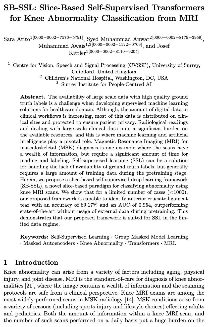 4、[CV] SB-SSL: Slice-Based Self-Supervised Transformers for Knee Abnormality Classification from MRI