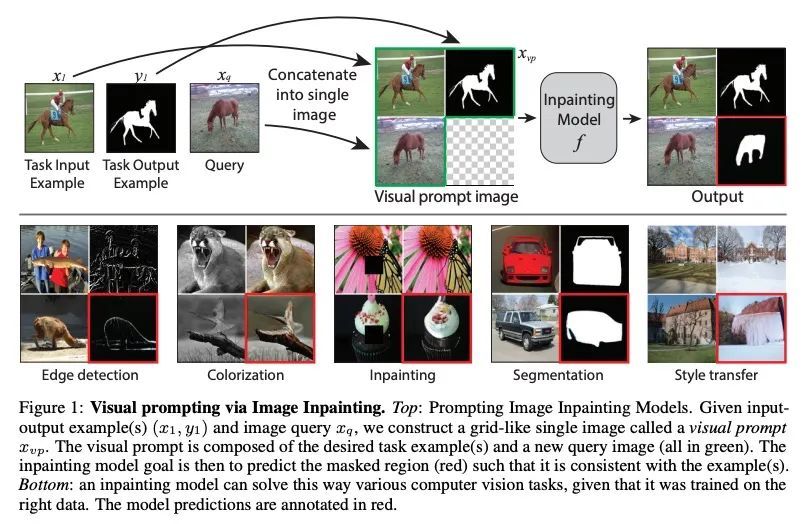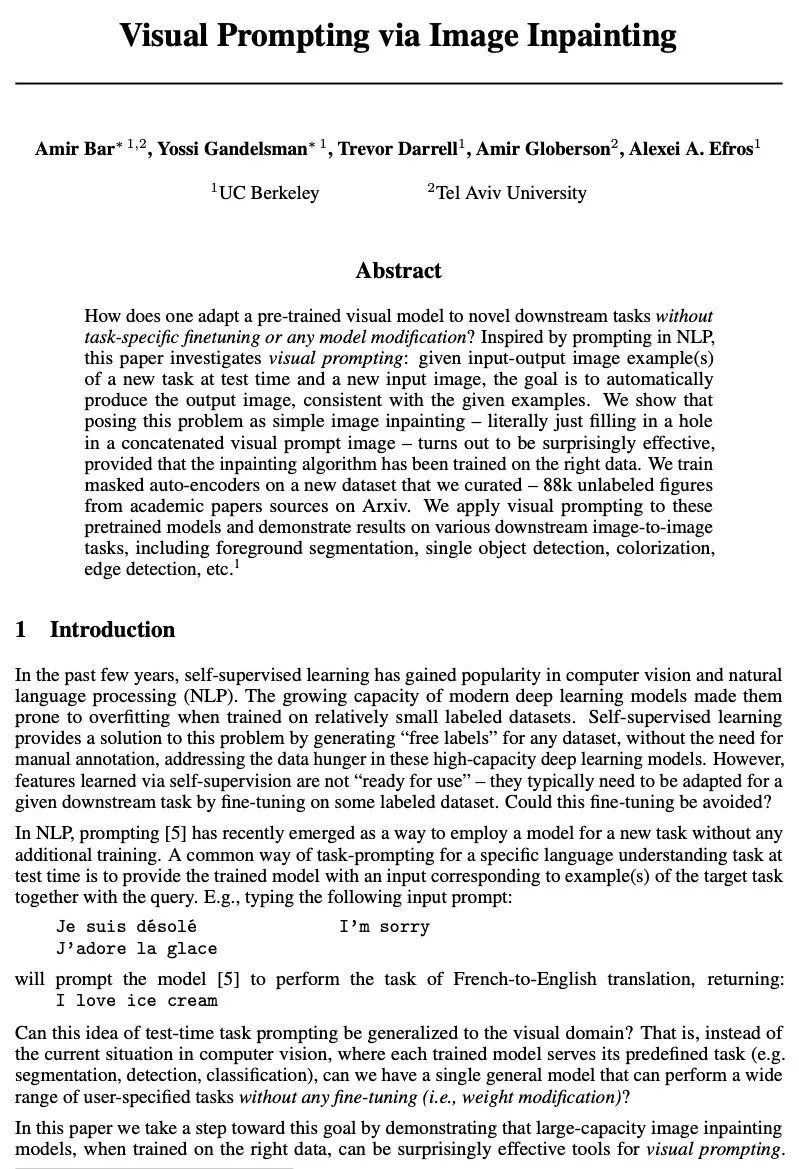 How does one adapt a pre-trained visual model to novel downstream tasks without task-specific finetuning or any model modification? Inspired by prompting in NLP, this paper investigates visual prompting: given input-output image example(s) of a new task at test time and a new input image, the goal is to automatically produce the output image, consistent with the given examples. We show that posing this problem as simple image inpainting – literally just filling in a hole in a concatenated visual prompt image – turns out to be surprisingly effective, provided that the inpainting algorithm has been trained on the right data. We train masked auto-encoders on a new dataset that we curated – 88k unlabeled figures from academic papers sources on Arxiv. We apply visual prompting to these pretrained models and demonstrate results on various downstream image-to-image tasks, including foreground segmentation, single object detection, colorization, edge detection, etc.