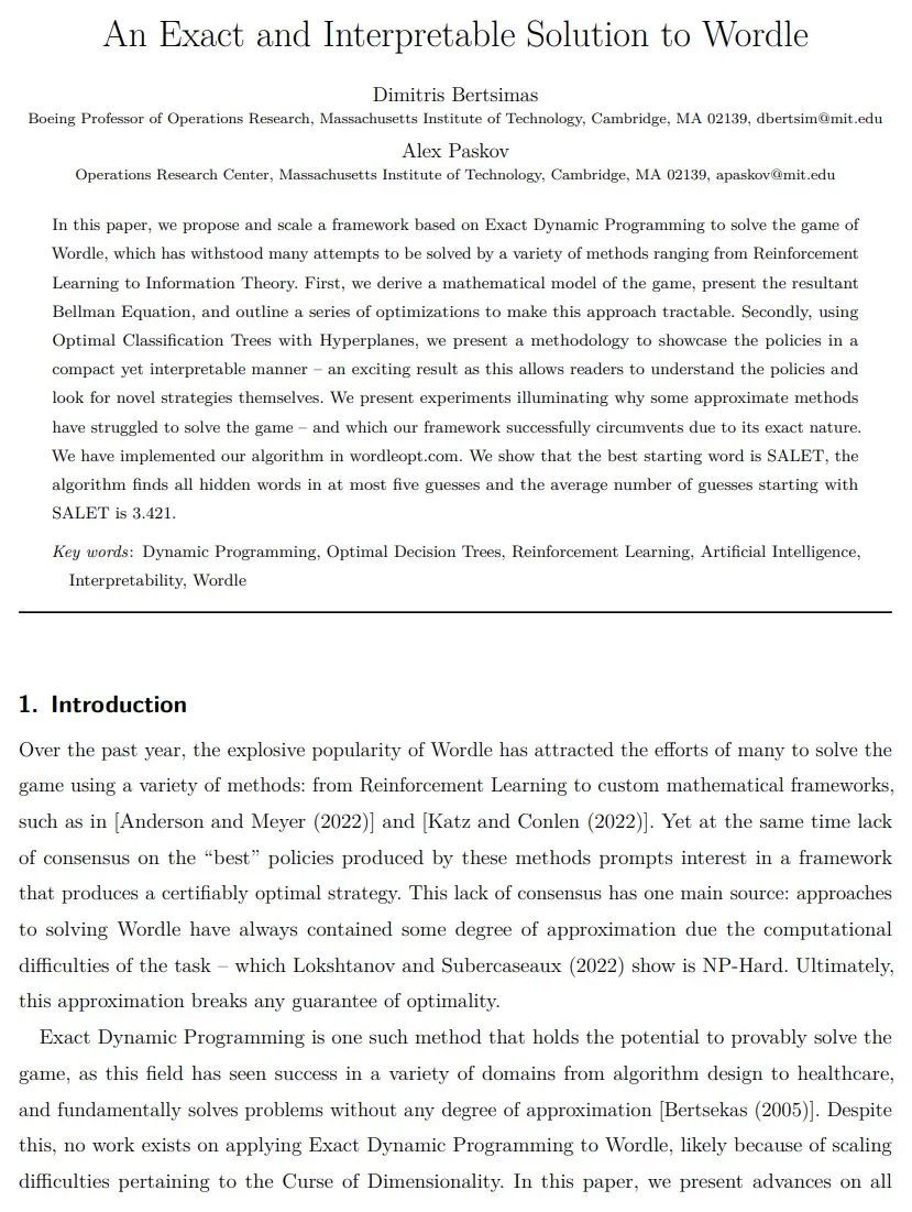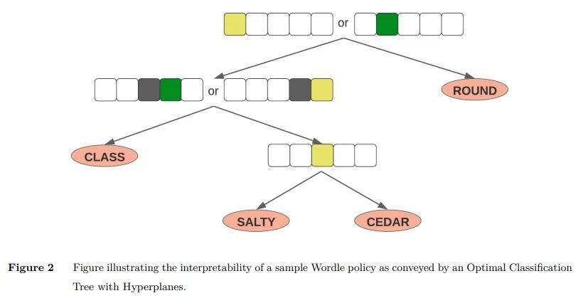 Wordle的精确可解释解决方案。本文提出一种基于精确动态规划的框架来解决Wordle游戏,该游戏经受住了从强化学习到信息论等多种方法的尝试。首先,本文推导出一个游戏的数学模型,提出由此产生的贝尔曼方程,并概述了一系列的优化措施,以使这种方法变得可行。其次,通过用超平面优化分类树,本文提出一种方法,以一种紧凑但可解释的方式展示策略——这是一个令人兴奋的结果,因为这允许读者理解策略并自己寻找新策略。本文给出了一些实验,阐明了为什么一些近似方法难以解决该游戏——而本文框架由于其精确的性质,成功地规避了这一点。实验表明,最好的起始词是SALET,该算法在最多五次猜测中找到所有的隐藏词,从SALET开始的平均猜测次数为3.421。