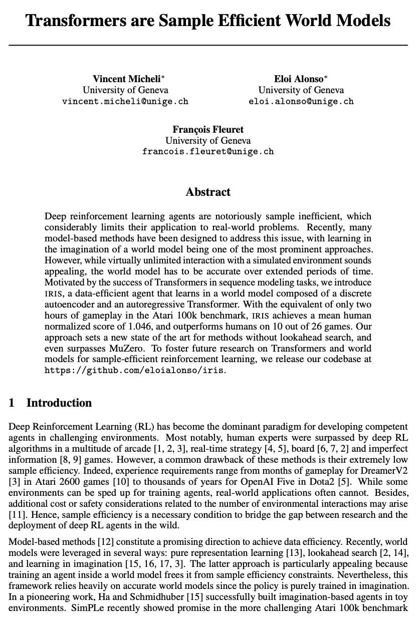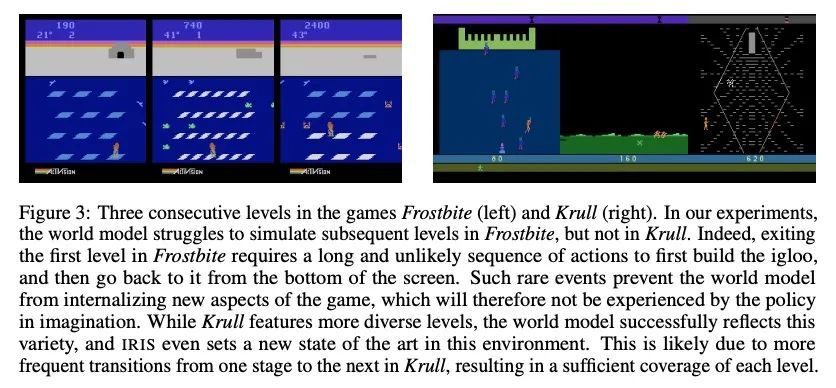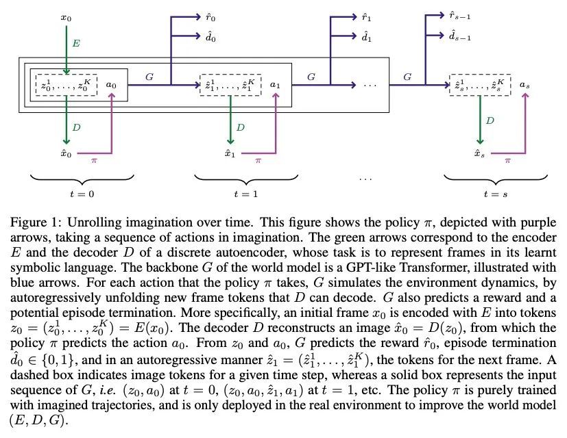 Transformer是样本高效的世界模型。深度强化学习智能体是众所周知的样本效率低下,这大大限制了它们对现实世界问题的应用。最近,设计了许多基于模型的方法来解决这个问题,其中在世界模型的想象中学习是最突出的方法之一。然而,虽然与模拟环境的几乎无限的交互听起来很吸引人,但世界模型必须在很长一段时间内是准确的。在Transformer在序列建模任务中成功的激励下,本文提出了IRIS,一种在由离散自编码器和自回归Transformer组成的世界模型中学习的数据高效的智能体。在Atari 100k基准测试中,IRIS只用了相当于两小时的游戏时间,就取得了1.046的人类归一化平均分,并在26个游戏中的10个游戏中优于人类。所提出方法为没有前瞻搜索的方法设定了一个新的技术状态,甚至超过了MuZero。IRIS的世界模型获得了对游戏机制的深刻理解,从而在一些游戏中实现了像素的完美预测。本文还说明了世界模型的生成能力,在想象训练时提供了丰富的游戏体验。IRIS以最小的调整开辟了一条有效解决复杂环境问题的新道路。