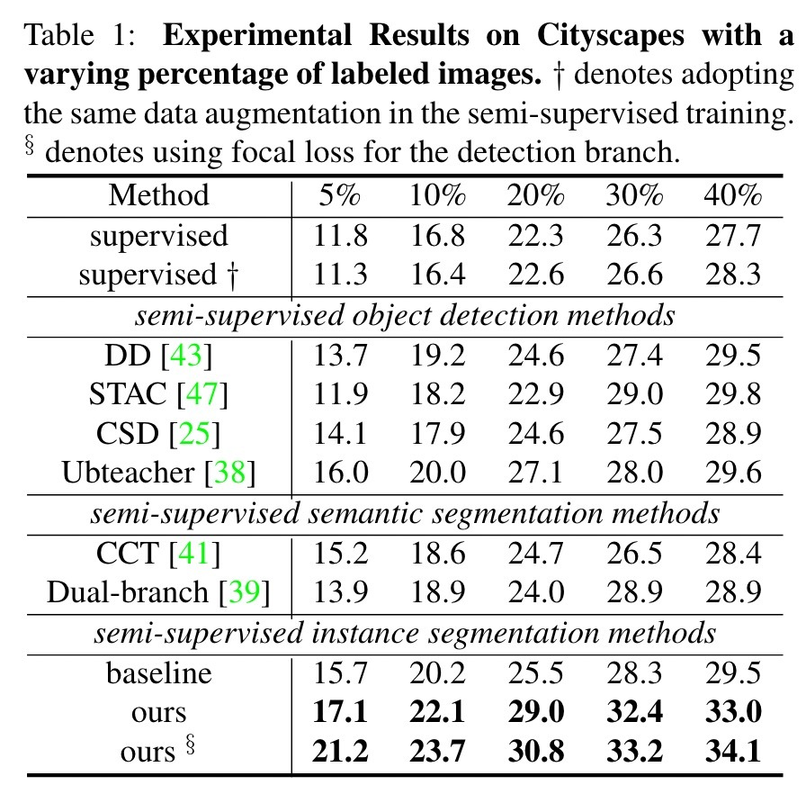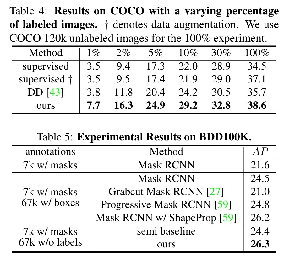 我们评估了Cityscapes数据集[16],COCO36]和BDD100K [56]。 CityScapes为培训集提供了2,975张图像。此外,它由20,000张带有粗体注释的图像组成。可可包括118,287张图像。它还提供123,403张未标记的图像。 BDD100K是一个关于视觉驾驶场景的多元化数据集。 BDD100K的一个子集是像素级注释:大约具有掩码注释和带有框注释的70k图像的7K图像。其中,有67K图像具有框级注释,但没有像素级标签。我们的方法是用Pytorch [42]和MMDetection [10]实现的。除非另有说明,否则我们将Mask RCNN [19]与ResNet50 [20]和FPN [34]一起使用。