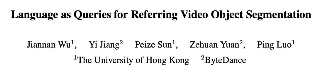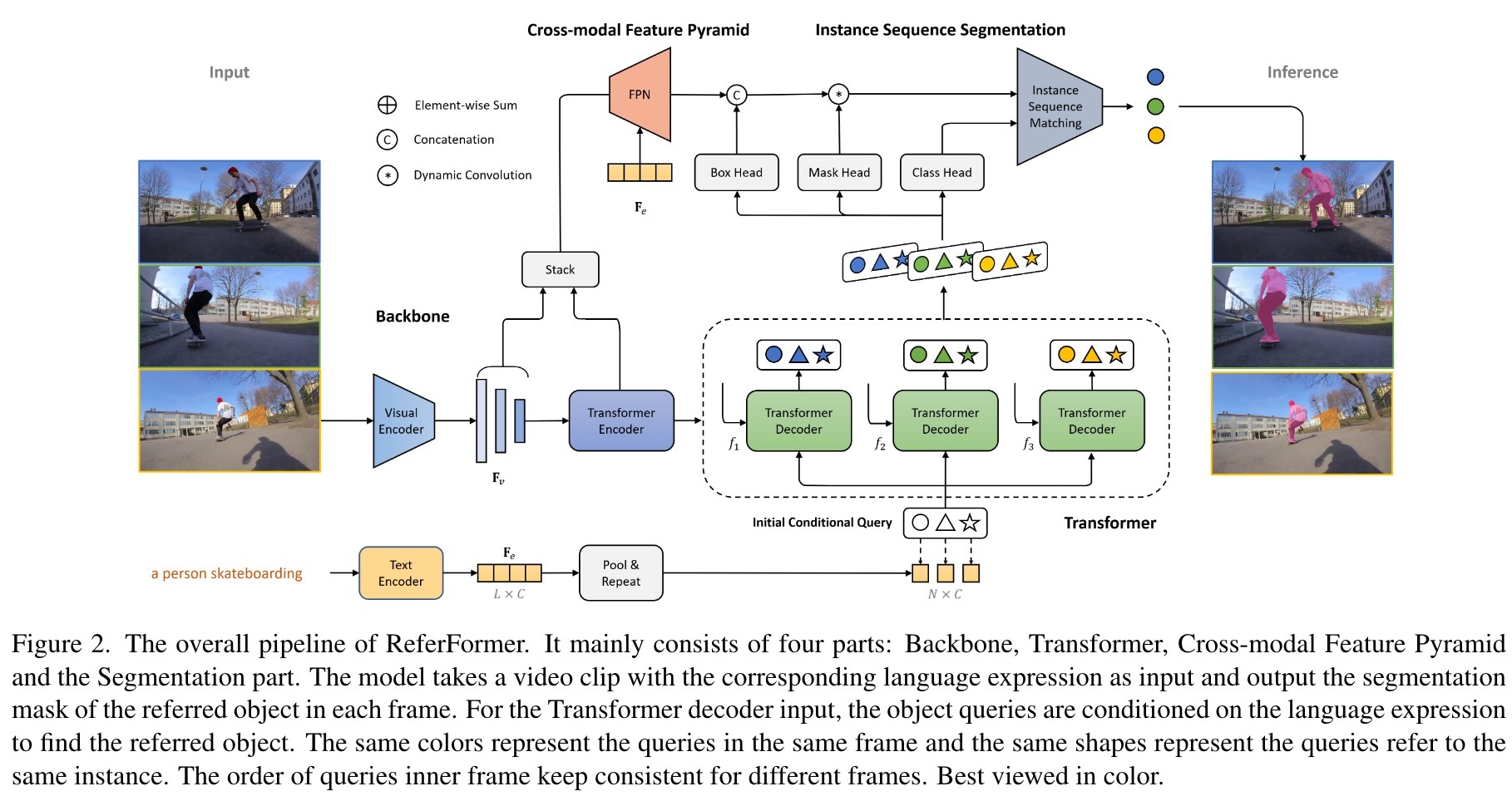 - 我们提出了一个简单而统一的框架,用于引用视频对象分割,称为Referformer。给定视频剪辑和相应的语言表达式,我们的框架直接以端到端的方式以所有框架来检测,段和跟踪所引用的对象。