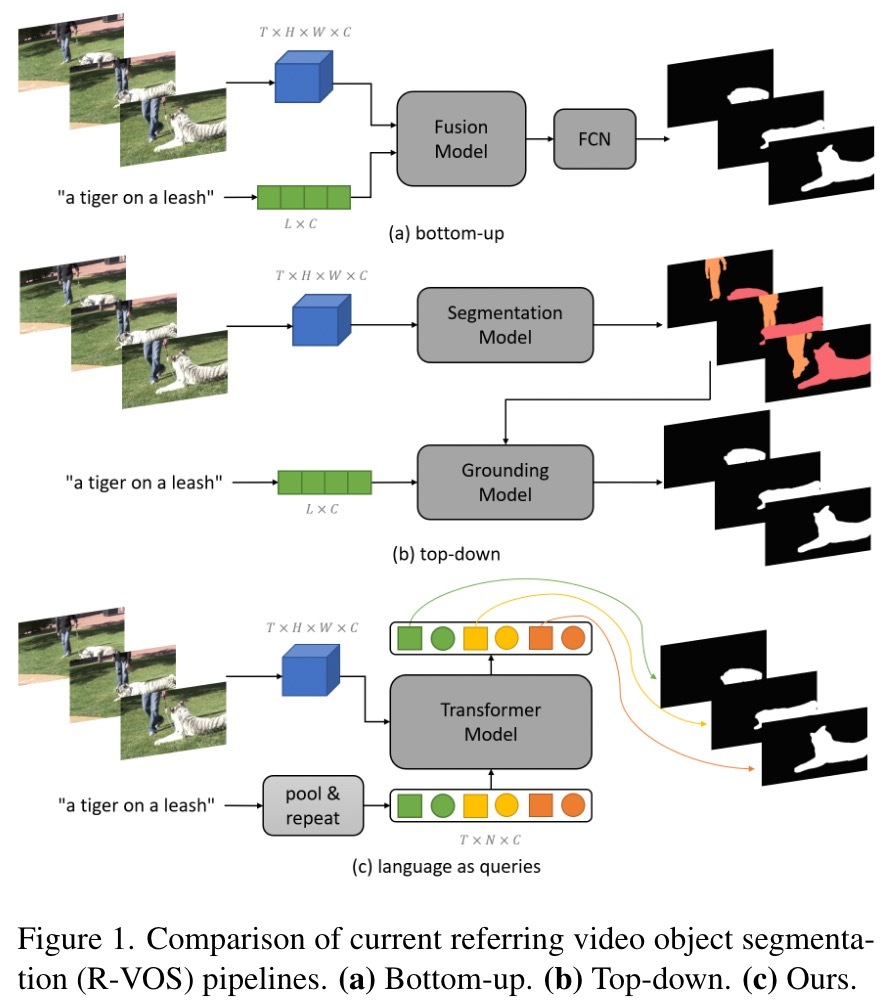 - 我们将语言的概念作为查询。我们介绍了一组少量的对象查询,该查询以文本表达式为条件,仅参考对象。这些条件查询在初始状态下的不同帧共享,并将其转换为动态内核,以从特征地图中滤除分割掩码。这种机制为R-VOS任务提供了新的视角。