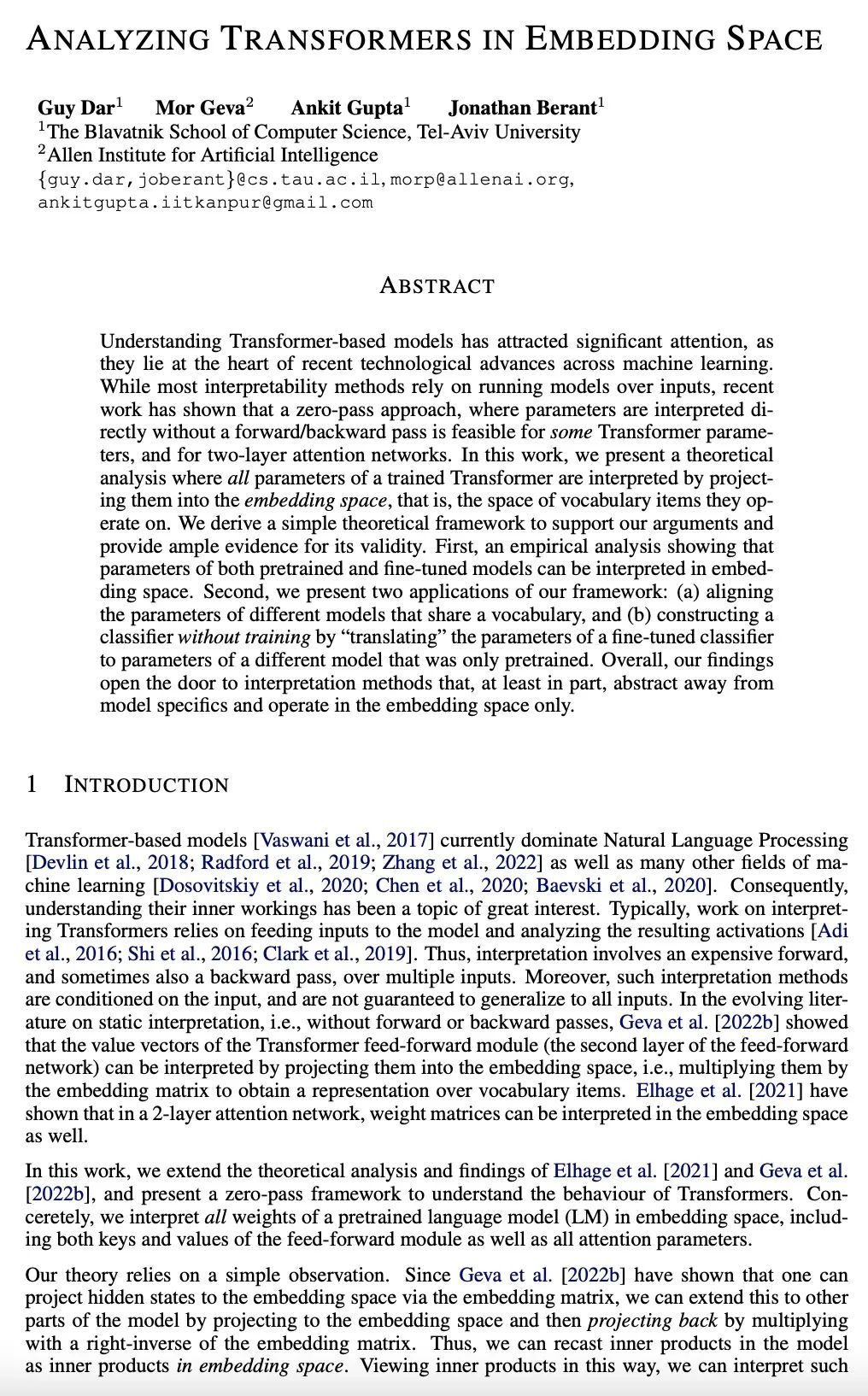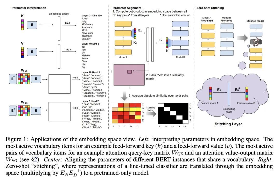 嵌入空间Transformer分析。对基于Transformer的模型的理解,已经引起了极大的关注,因为它们是整个机器学习的最新技术进步的核心。虽然大多数可解释性方法依赖于在输入上运行模型,但最近的工作表明,对于某些Transformer参数和两层注意力网络来说,zero-pass方法,即不通过前向/后向通道直接解释参数是可行的。本文提出一种理论分析,即训练好的Transformer的所有参数都通过投射到嵌入空间来解释,也就是它们所操作的词汇项的空间。本文推导出一种简单的理论框架来支持所提出的论点,并为其有效性提供了大量证据。首先,一个经验性的分析表明,预训练和微调模型的参数都可以在嵌入空间中得到解释。其次,本文提出所提框架的两个应用:(a)对齐共享词汇不同模型的参数,以及(b)通过"翻译"微调分类器的参数到只经过预训练的不同模型的参数,构建一个无需训练的分类器。总的来说,本文发现为解释方法打开了大门,这些方法至少部分地从模型的细节中抽象出来,只在嵌入空间中操作。