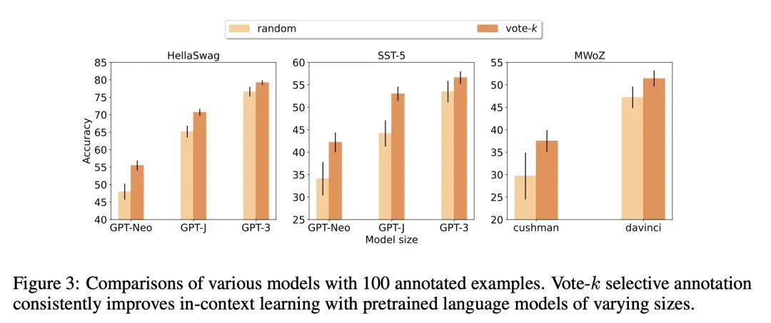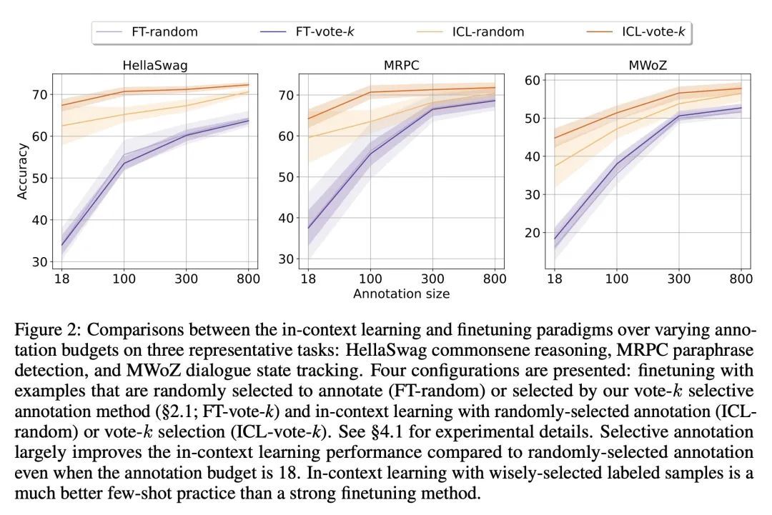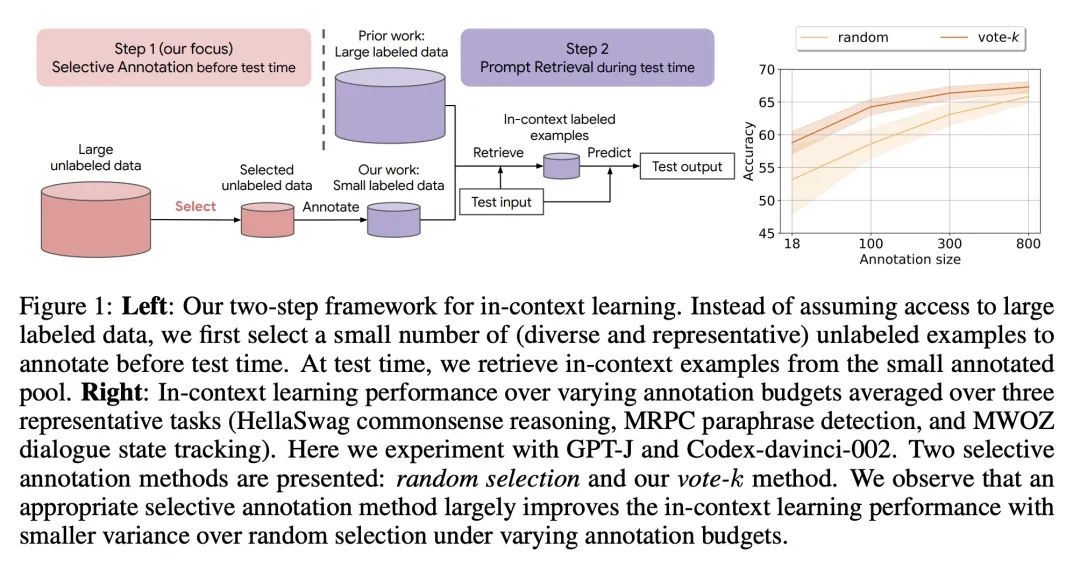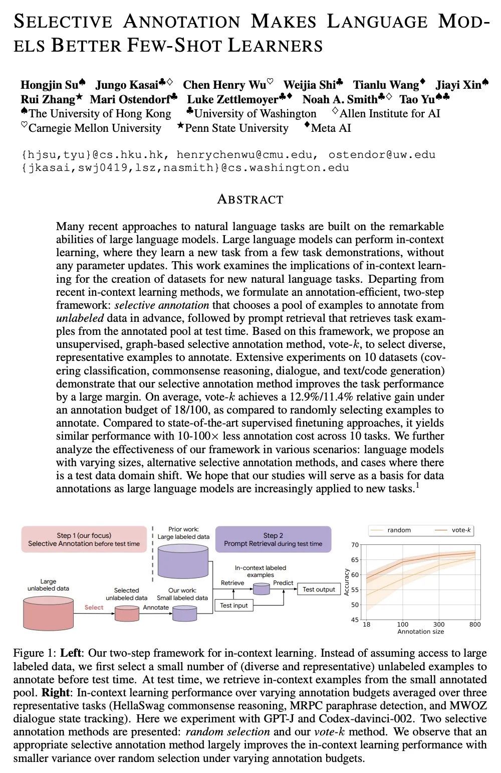 选择性标注让语言模型成为更好的少样本学习器。最近许多处理自然语言任务的方法都建立在大型语言模型的卓越能力之上。大型语言模型可以进行上下文学习,从一些任务演示中学习新的任务,而不需要任何参数更新。本文研究了上下文学习对创建新的自然语言任务的数据集的影响。从最近的上下文学习方法出发,本文制定了一种标注高效的两步框架:选择性标注,事先从未标记数据中选择一个样本池进行标注,然后进行提示检索,在测试时从标注池中检索任务样本。基于该框架,本文提出一种无监督的、基于图的选择性标注方法voke-k,来选择不同的、有代表性的样本来进行标注。在10个数据集(涵盖分类、常识推理、对话和文本/代码生成)上进行的广泛实验表明,所提出的选择性标注方法在很大程度上提高了任务性能。平均来说,在18/100的标注预算下,vote-k实现了12.9%/11.4%的相对收益,与随机选择标注的样本相比。与最先进的有监督微调方法相比,在10个任务中以10-100倍少的标注成本获得了类似的性能。本文进一步分析了该框架在各种情况下的有效性:具有不同规模的语言模型、替代性的选择性标注方法,以及存在测试数据域漂移的情况。