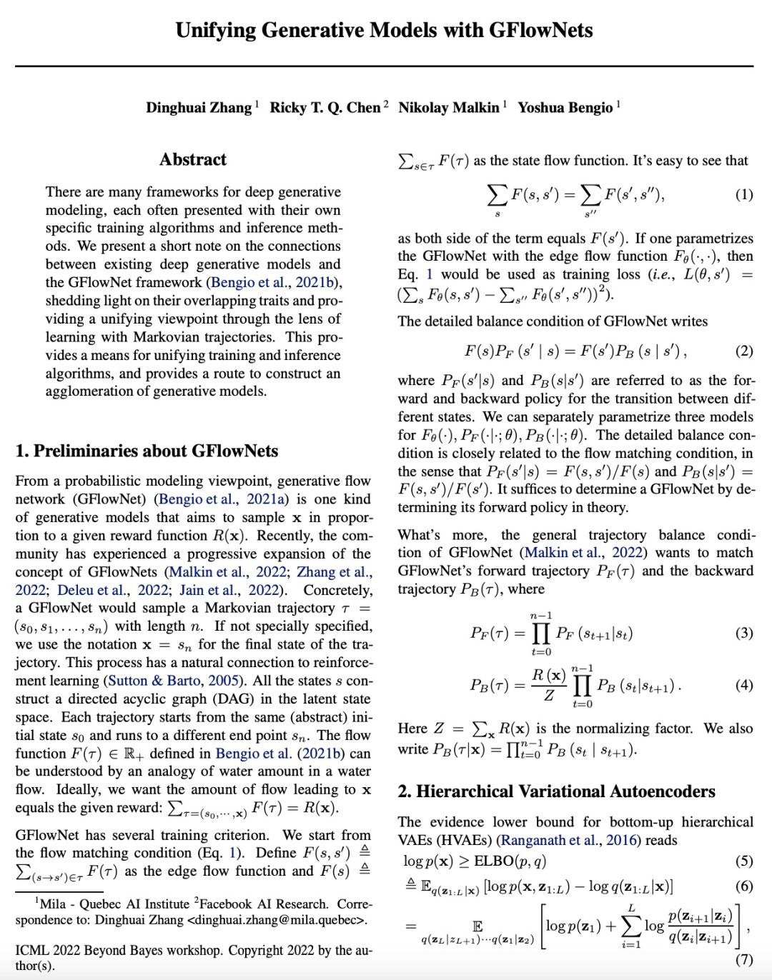 用GFlowNets统一生成式模型。已经有很多深度生成式模型的框架,每个框架都有自己的特定训练算法和推理方法。本文就现有的深度生成式模型和GFlowNet框架之间的联系做了一个简短的说明,揭示了它们重叠的特征,并通过马尔科夫轨迹学习的视角提供了一个统一观点。这为统一训练和推理算法提供了一种手段,并为构建生成式模型的聚合提供了一条途径。