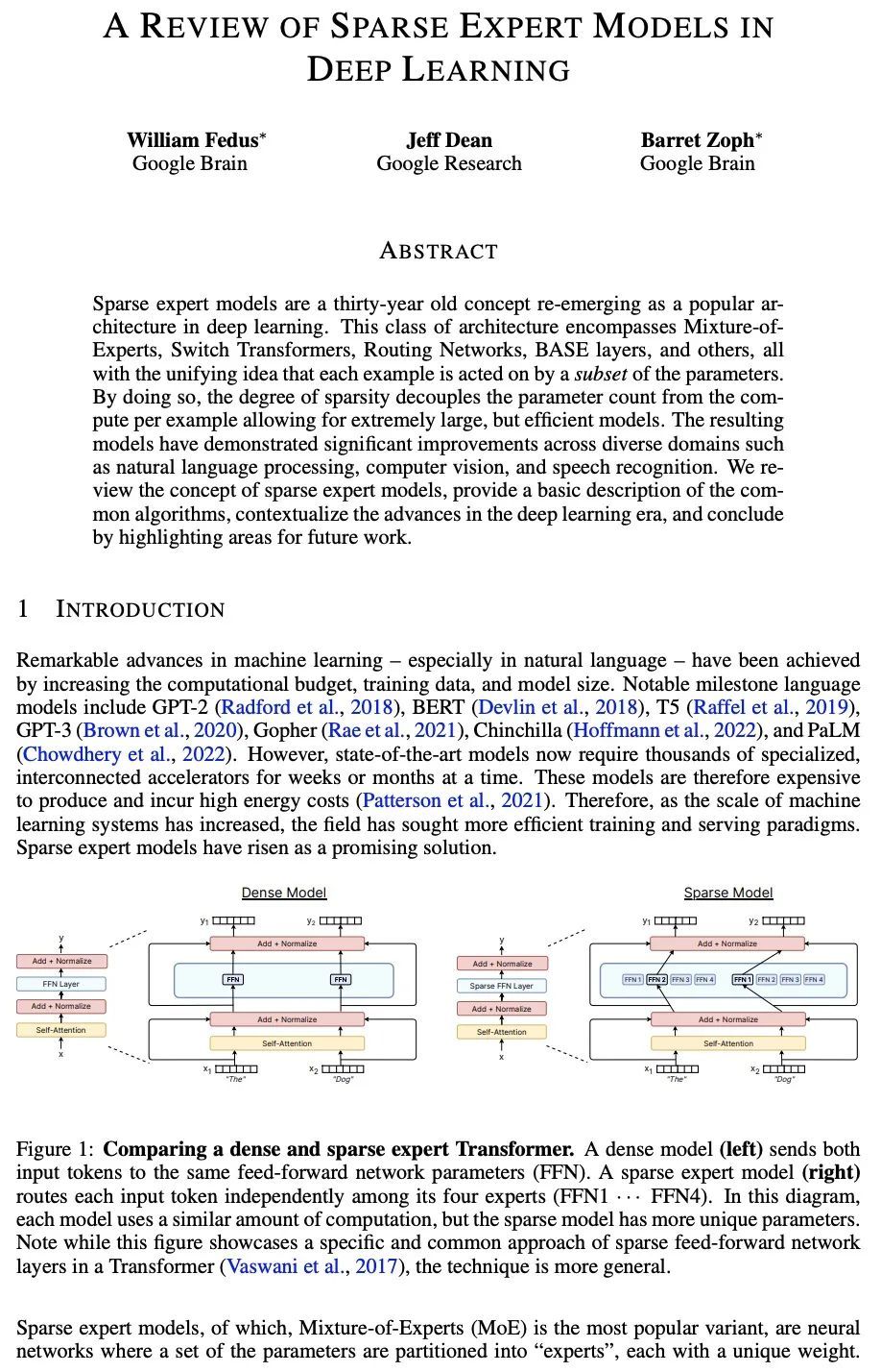 深度学习稀疏专家模型综述。稀疏专家模型是个有30年历史的概念,作为深度学习的一种流行架构重新出现。这类架构包括Mixture-of-Experts、Switch Transformers、Routing Networks、BASE层等,它们的统一理念是每个例子都是由参数的一个子集作用的。通过这样做,稀疏程度将参数数量与每个实例的计算量相分离,从而允许建立极其庞大但高效的模型。由此产生的模型在不同的领域,如自然语言处理、计算机视觉和语音识别,都有明显的改进。本文回顾了稀疏专家模型的概念,提供了常见算法的基本描述,介绍了深度学习时代的进展,并在最后强调了未来工作的领域。