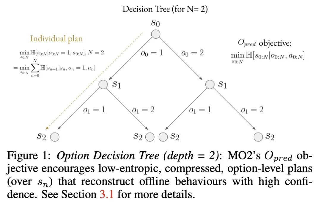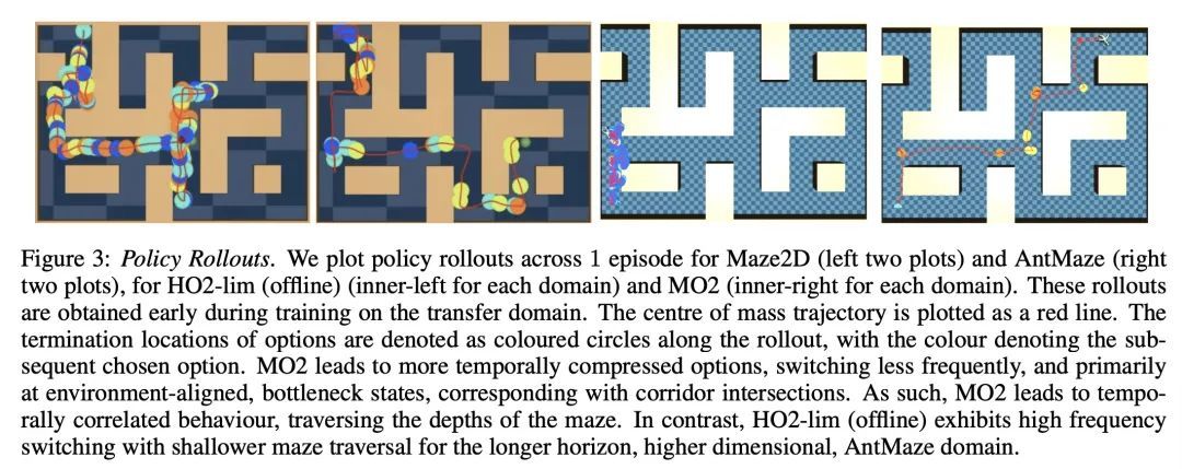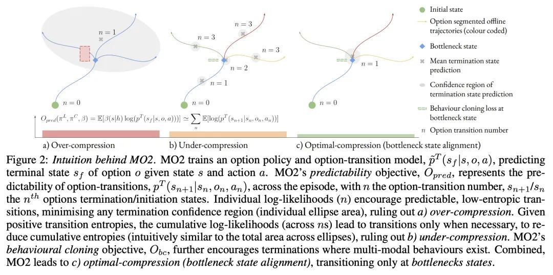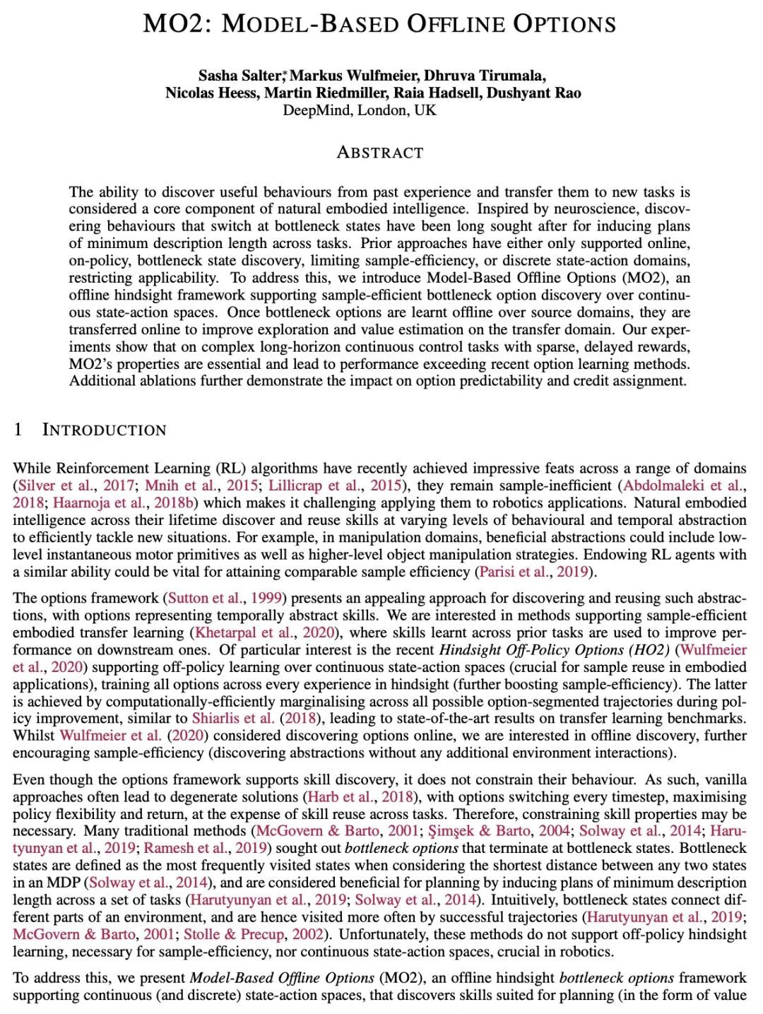 MO2: 基于模型的离线选项。从过去的经验中发现有用的行为,并将其迁移到新任务的能力,被认为是自然体现智能的一个核心组成部分。受神经科学的启发,发现在瓶颈状态下的切换行为一直是人们追求的目标,以归纳跨任务的最小描述长度的规划。之前的方法要么只支持在线的、策略性的、瓶颈状态的发现,限制了样本效率,要么是离散的状态动作域,限制了适用性。为解决该问题,本文提出基于模型的离线选项(MO2),一种离线后知框架,支持在连续状态动作空间中进行样本高效的瓶颈选项发现。一旦在源域上离线学习了瓶颈选项,就会在线迁移以改善迁移域上的探索和价值估计。实验表明,在具有稀疏、延迟奖励的复杂长跨度连续控制任务中,MO2的特性是至关重要的,使其性能超过最近其他选项学习方法。额外的消融进一步证明了其对选项可预测性和信用分配的影响。