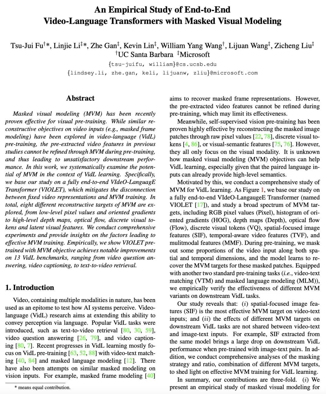 [CV] An Empirical Study of End-to-End Video-Language Transformers with Masked Visual Modeling基于掩码视觉建模的端到端视频-语言Transformer实证研究