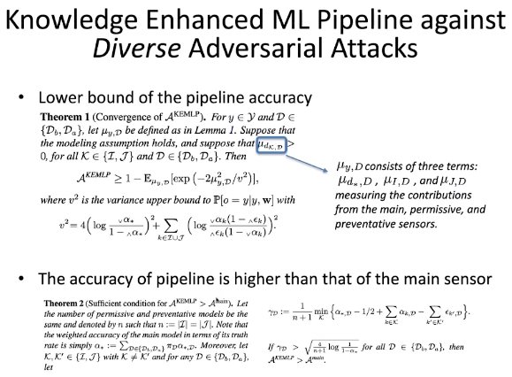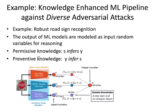通过知识增强的机器学习框架也可以应对各种不同的对抗性攻击。对于「停止」路标,人类可以通过形状、颜色、文字等特征帮助对于路标的识别。然而,目前的技术还很难将这些特征强加于深度学习模型或统计模型中。为此,李博老师团队考虑通过引入额外的知识来提升模型的性能。