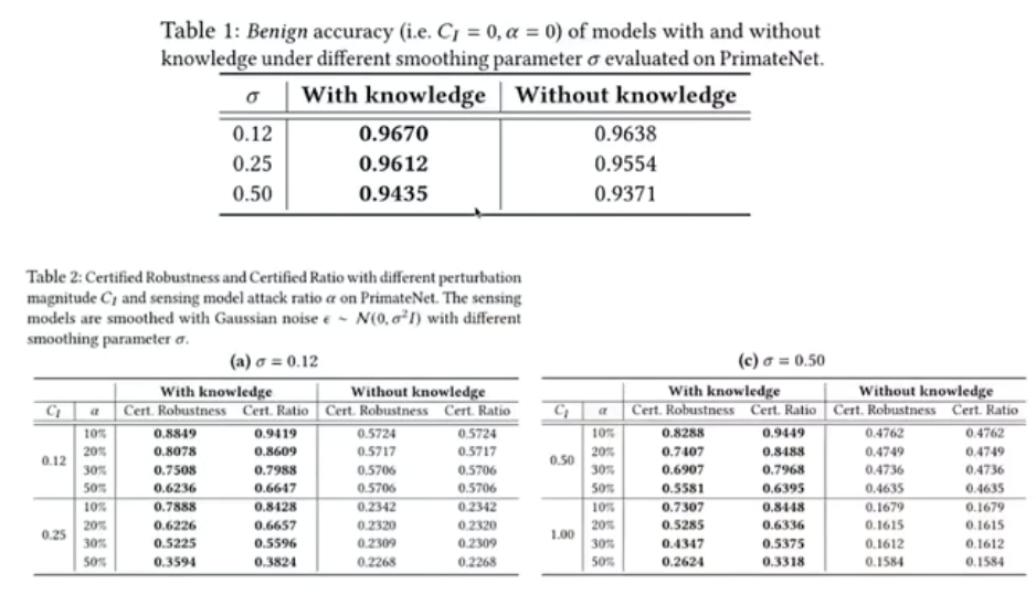 在表 2 中,「Certified Robustness」和「Certified Ratio」都刻画了扰动前后预测结果的一致性,而前者进一步要求预测结果与真实正确标签相符,σ 为随机平滑的参数。对于各种感知器被攻击的比例,可确保的鲁棒性都较目前最优的方法有 30%-40% 的巨大提升。