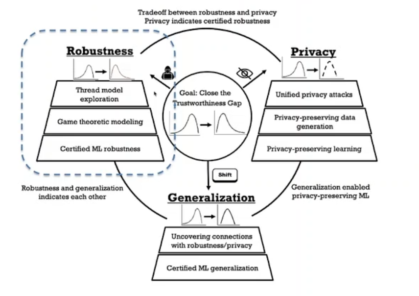 总结来讲,在一些能够实际应用的场景下,能给这些机器学习的应用场景提供可信的保障,这些可信的保障,包括鲁棒性、隐私、公平性的保障。
