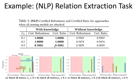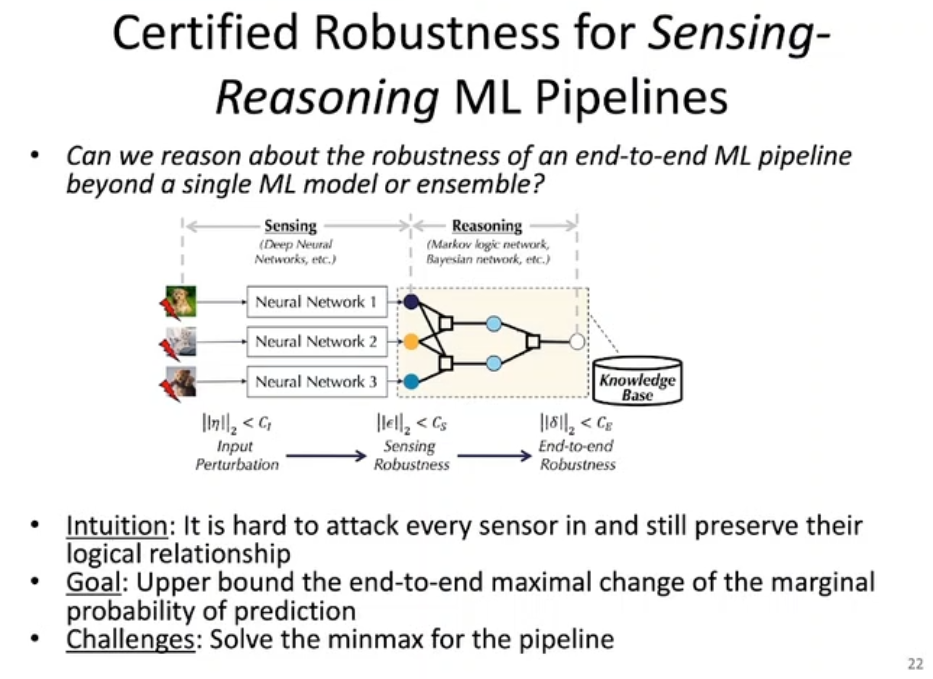 在上图中,李博老师团队提出了一种基于「感知-推理」机制的具有鲁棒性保障的机器学习框架。其中,感知模块为神经网络、支持向量机(SVM)等统计模型,推理模块为马尔科夫逻辑网络(MLN)、贝叶斯网络等概率图模型。感知模块的输出会被输入给推理模块。概率图模型中的连边可以代表某些具体的知识规则。我们不仅要确保基于统计的感知模型在面对满足一定约束的扰动时具有鲁棒性,也需要保证推理模块的鲁棒性,从而得到端到端的鲁棒性保障。
