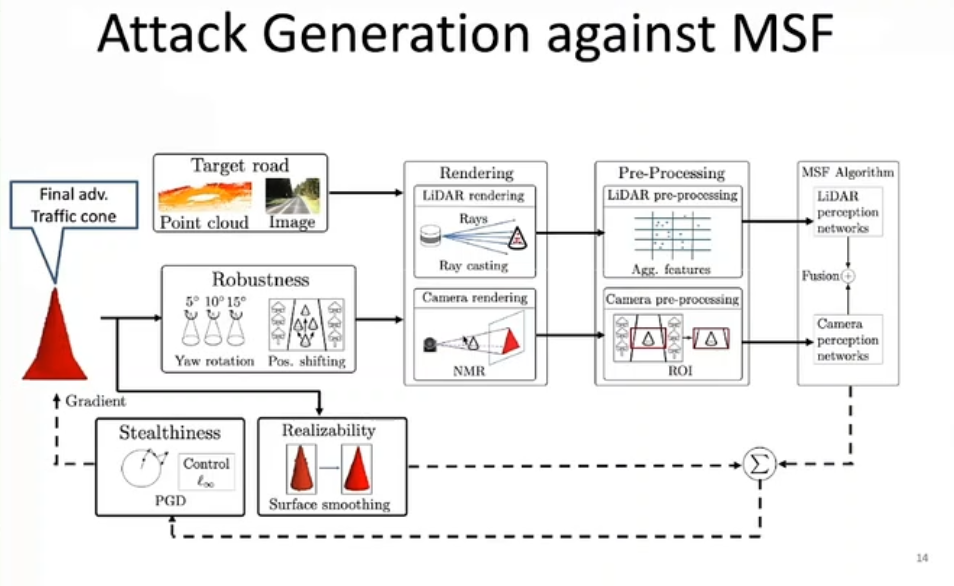 一些学者曾提出通过传感器集成来提升整体自动驾驶系统的鲁棒性。然而,如上图所示,攻击者可以同时针对不同的传感器进行优化,例如:针对摄像头优化纹理,针对 Lidar 优化形状。李博老师团队在百度的 Apollo 5.0 和 LGSVL 自动驾驶仿真平台上测试了对传感器融合系统的攻击,感兴趣的读者可以通过下列链接动手测试更多的多传感器融合攻击案例:https://aisecure.github.io/BLOG/MRF/Home.html