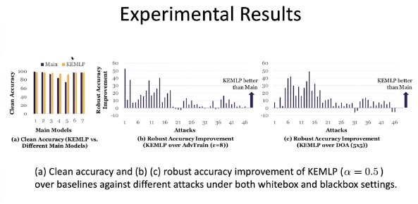 实验结果表明,从「良性准确率」的角度来说,李博老师团队提出的 KEMLP 框架在鲁棒性和准确率上都取得了提升。此外,针对 46 种不同类型的攻击方法(白盒攻击、黑盒攻击、自然情况下的攻击),采用 KEMLP 均可以得到鲁棒准确率的提升,证明了该框架是与任务无关的。