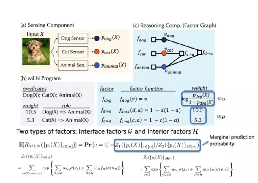 在上述框架中,我们要训练各种因子的权重,目标是估计出 MLN 的边缘预测概率的上/下界,从而确保「输入的改变导致的输出改变在一定的区间内」。因子包括接口因子 G 和内部因子 H(规则)。需要估计的边缘预测概率为