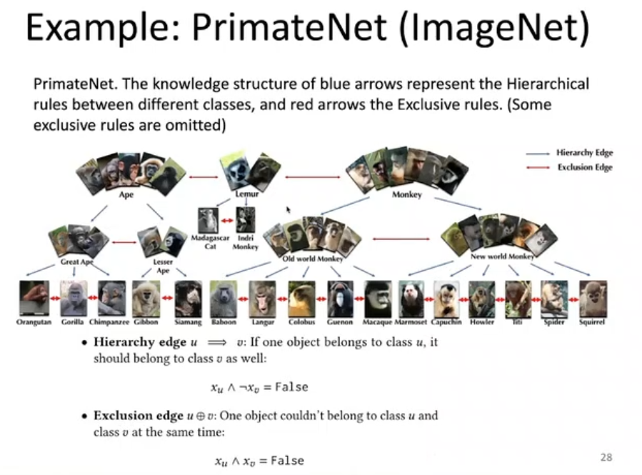 李博老师团队在 PrimateNet 数据集进一步测试了上述框架。PrimateNet 是 ImageNet 的子集,具有很强的可扩展性。该数据集包含灵长类动物之间的层次关系和互斥关系,可以表示为一阶逻辑的形式。李博老师将这种一阶逻辑嵌入到 MLN 中,构建了上述段到段的模型框架。