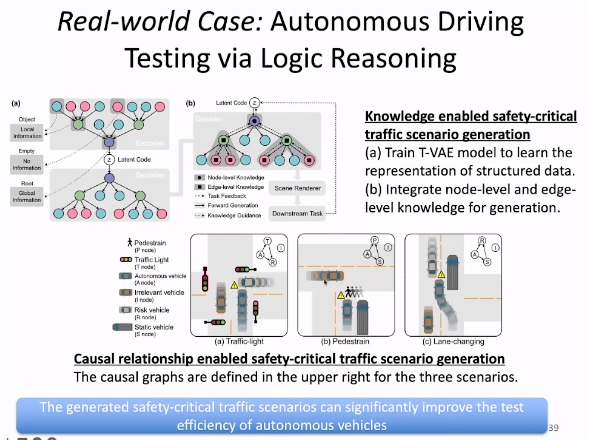 除了提升可保障鲁棒性的模型性能之外,我们还可以将知识引入在现实世界中具有巨大应用价值的生成模型中。例如,在自动驾驶测试任务中,一些与安全紧密相关的情况往往处于长尾分布中,需要生成相应的数据用于模型训练。然而,生成的这些场景需要符合交通规则、人类常识等知识。我们可以通过向生成模型中引入这些物理规则和因果关系,让模型生成的场景满足真实世界的要求。