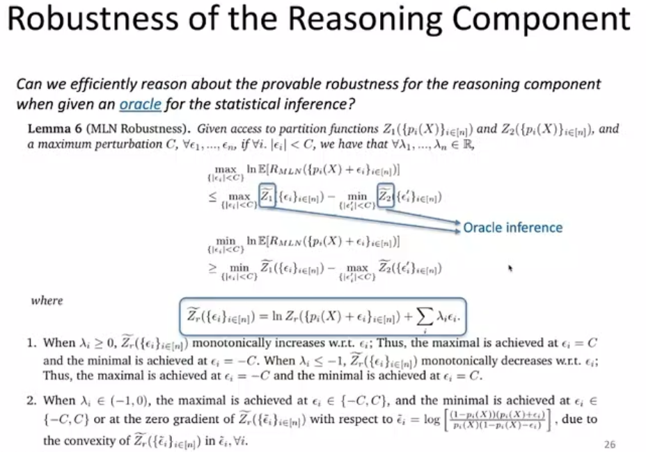 在确定了困难度之后,由于推理过程很复杂,我们给出了如上图所示的理想推理情况(oracle Inference),其中 C 为扰动的上界,λ 为扰动的系数。李博老师指出,当 λ 大于 0 或小于 -1 时, 分别是单调递增或单调递减的,可以在和 处分别取到极大值和极小值。当时,是凸函数,极大值可以在某个端点取到,极小值可以在中的某个端点或梯度为 0 的点取到,从而得到器上/下界。除了 MLN 之外,如果我们用单层神经网络或贝叶斯网络替代上文中的 MLN,也会得到类似的结论。