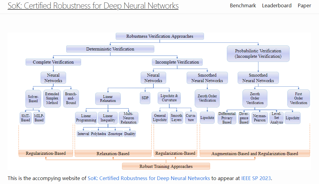 如上图所示,李博老师团队整理了大多数「机器学习的鲁棒性保障」领域的工作,并在下列网页上构建了排行榜,给出了相关方法的开源代码:https://sokcertifiedrobustness.github.io。他们将「鲁棒性验证方法」分为「完全」和「不完全」两类。「完全」的鲁棒性验证方法可以完全确认模型的鲁棒性,「不完全」的验证方法则无法判断究竟是「保障」方法较弱还是模型本身并不鲁棒。相较之下,「完全」的鲁棒性验证方法更强大,但是计算开销也更大。