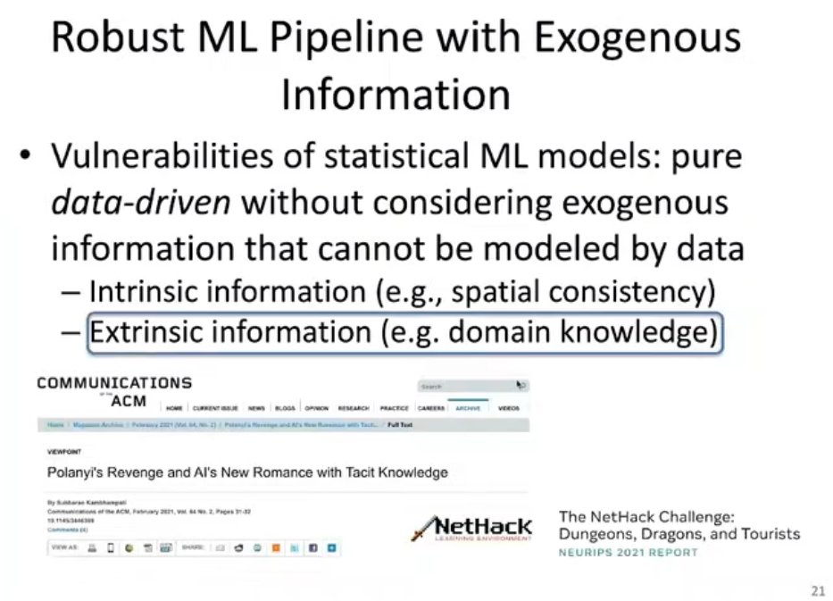 为了进一步提升可保障的模型性能下限,李博老师认为纯粹数据驱动的方法已经遇到了瓶颈,需要向「鲁棒性保障」领域引入新的思路和额外的信息,例如:域知识、逻辑推理。在 NeurIPS 2021 上,研究者们组织了名为「The NetHack Challege」的挑战赛,获得冠军的参赛者在强化学习系统中引入了域知识。