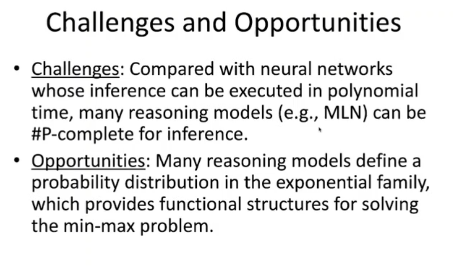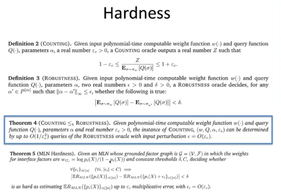 这一构想非常具有挑战性,我们可以将鲁棒性定义为上图中「定义 3」的形式。在防御和攻击的两种数据分布下,如果我们从攻击中采样一个实例,我们希望预测的概率之差小于 δ。为此,我们可以将著名的技术问题化规为鲁棒性问题。举例而言,MLN 的复杂度是 #P-完全的。