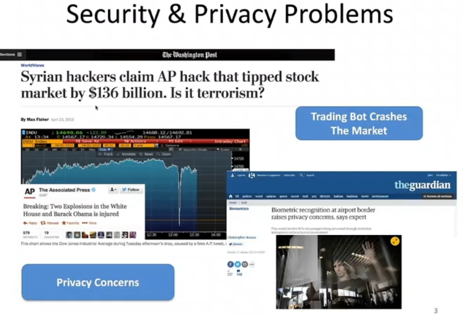 2016 年,叙利亚的黑客攻击了美联社的推特账户,控制了「Trading Bot」,在短时间内抛售了大量的股票。类似的情况在现实世界中屡见不鲜,例如:机场和一些重要的支付系统采用生物识别、人脸识别系统,这会带来系统安全、数据隐私、数据资产被盗用、身份认证等方面的隐患。此外,与人工智能相关的道德、公平性等方面的问题也有待进一步讨论。