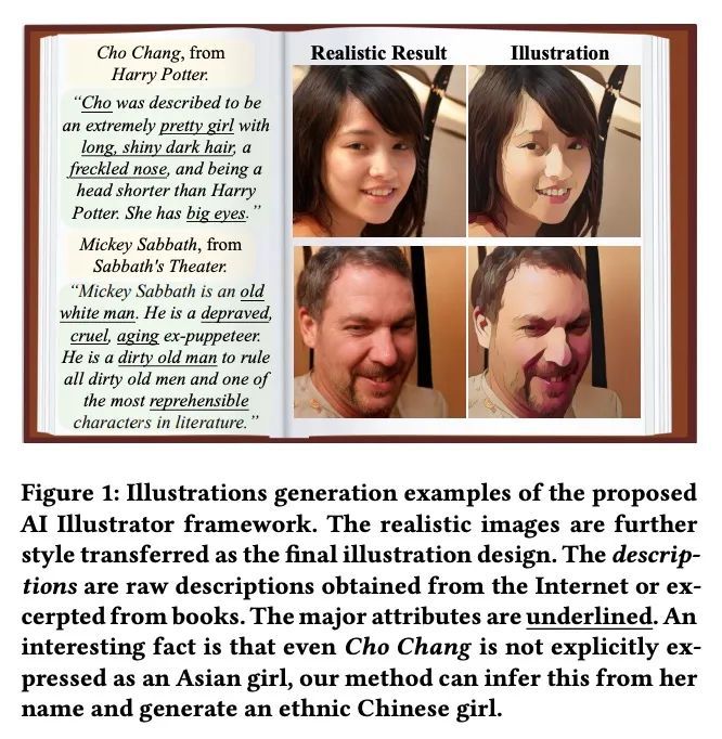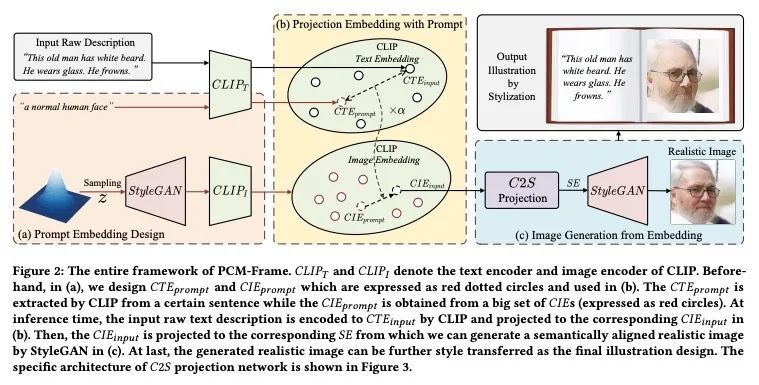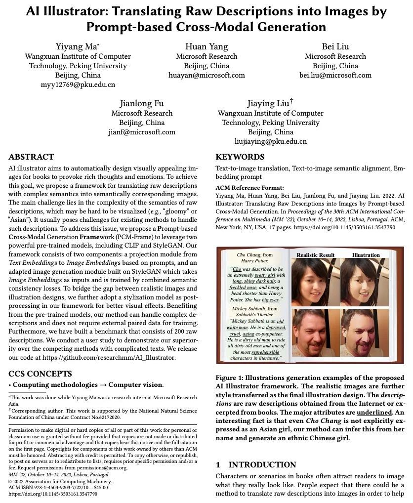 AI插画师: 通过基于提示的跨模态生成将原始描述翻译成图像。AI插画师的目的是为书籍自动设计出具有视觉吸引力的图像,以激发丰富的思想和情感。为实现这一目标,本文提出一种框架,将具有复杂语义的原始描述翻译成语义上对应的图像。主要的挑战在于原始描述的语义的复杂性,有可能很难被视觉化(例如,"阴郁"或"亚洲人")。这通常给现有的方法处理这种描述带来了挑战。为解决这个问题,本文提出一种基于提示的跨模态生成框架(PCM-Frame)来利用两个强大的预训练模型,包括CLIP和StyleGAN。该框架由两部分组成:一个从文本嵌入到基于提示的图像嵌入的投影模块,以及一个建立在StyleGAN上的自适应图像生成模块,将图像嵌入作为输入,并通过合成语义一致性损失进行训练。为了弥补现实图像和插图设计之间的差距,进一步采用风格化模型作为框架的后处理,以获得更好的视觉效果。受益于预训练的模型,所提出方法可以处理复杂的描述,并且不需要外部的配对数据进行训练。此外,本文建立了一个由200条原始描述组成的基准。通过用户研究证明了所提框架在处理复杂文本时比其他竞争方法更有优势。