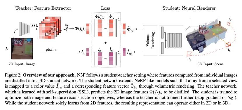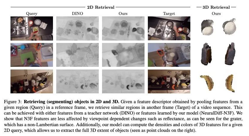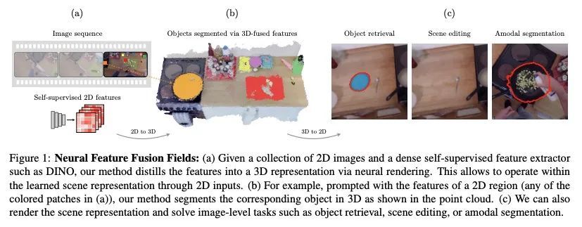 神经特征融合场:自监督2D图像表示的3D蒸馏。本文提出神经特征融合场(N3F),一种改进稠密2D图像特征提取器的方法,当后者被应用于可重构为3D场景的多幅图像的分析时。给定一个图像特征提取器,例如用自监督进行预训练,N3F将其作为教师来学习一个定义在3D空间的学生网络。3D学生网络类似于一个神经辐射场,可以蒸馏出上述特征,并可以用通常的可微渲染机制进行训练。因此,N3F很容易适用于大多数神经渲染方案,包括vanilla NeRF及其对复杂动态场景的扩展。所提出方法不仅能在不使用人工标签的情况下实现对特定场景神经场的语义理解,还能持续改进自监督的2D基线。这一点通过考虑各种任务得到了证明,如2D目标检索、3D分割和场景编辑,在不同的序列中,包括EPIC-KITCHENS基准的长自我中心视频。