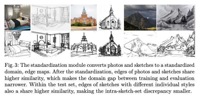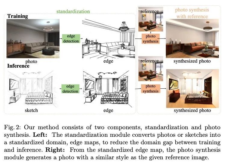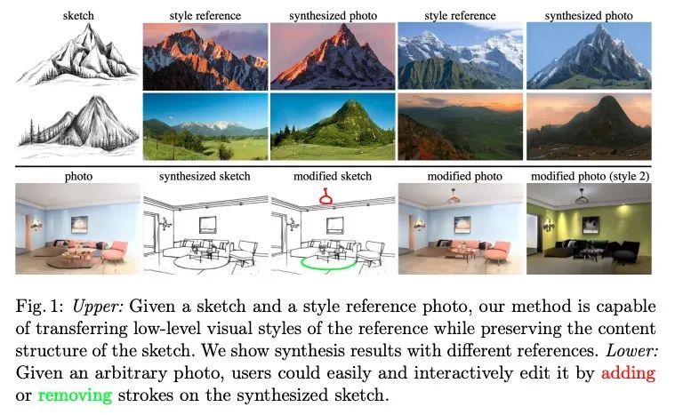 无监督场景草图的逼真照片合成。草图是一种直观而有力的视觉表达方式,因为它们是快速实现的自由手绘。本文提出一种从场景草图合成逼真照片的方法。在不需要草图和照片对的情况下,所提出框架以无监督方式直接从现成的大规模照片数据集中学习。为此,引入了一个标准化模块,通过将照片和草图转换到一个标准化的域,即边缘图,在训练期间提供伪草图-照片对。草图和照片之间域差距的缩小也使得能够将它们分解成两部分:整体的场景结构和低层次的视觉风格,如颜色和纹理。利用这一优势,通过结合草图的结构和参考照片的视觉风格来合成照片的逼真图像。对感知相似性指标和人类感知研究的广泛实验结果表明,所提出的方法可以从场景草图中生成具有高保真度的逼真照片,并优于最先进的照片合成基线。该框架通过编辑相应草图的笔画,促进了对照片合成的可控操作,比之前依赖区域级编辑的方法提供了更精细的细节。