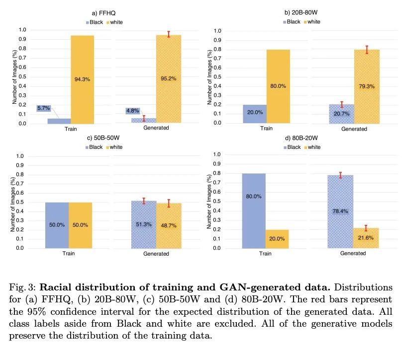 种族视角GAN偏差研究。本文研究生成式图像模型的性能和评估是如何被其训练数据集的种族构成所影响的。通过检查和控制各种训练数据集的种族分布,能观察到不同的训练分布对生成图像质量和生成图像的种族分布的影响。结果显示,生成图像的种族构成成功地保持了训练数据的种族构成。然而,也观察到,在推理过程中用于生成高质量图像的截断(truncation)技术加剧了数据中的种族不平衡。在研究图像质量和种族之间的关系时,发现一种特定种族的最高感知视觉质量的图像来自于该种族被充分表示的分布,并且标注者始终喜欢生成的白人图像而不是黑人图像。