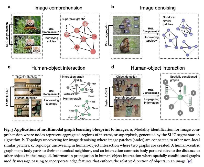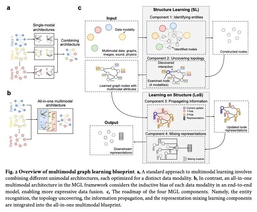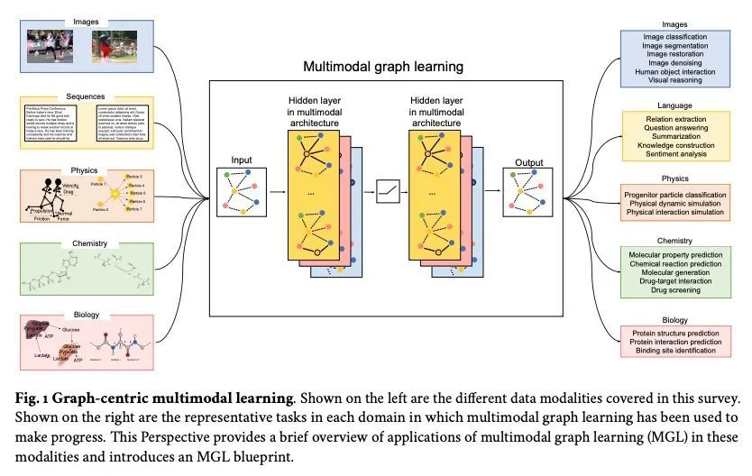 几何多模态表示学习。以图为中心的人工智能(图AI)在自然界普遍存在的交互系统建模方面取得了显著的成功,从生物学动态系统到粒子物理学。数据的异质性越来越强,这就需要能够结合多种归纳偏差的图神经架构。然而,结合来自不同来源的数据是具有挑战性的,因为适当的归纳偏差可能因数据模式而异。多模态学习方法融合了多种数据模态,同时利用跨模态的依赖性来解决这一挑战。本文调研了以图为中心的人工智能的140项研究,并意识到不同的数据类型越来越多地用图汇集在一起,并被送入复杂的多模态模型。这些模型分为图像、语言和知识为基础的多模态学习。本文提出一种基于这种分类的多模态图学习的算法蓝图。该蓝图作为一种方式,将处理多模态数据的最先进的架构适当地选择四种不同的组件。这一努力可以为高度复杂的现实世界问题的复杂多模态架构的标准化设计铺平道路。