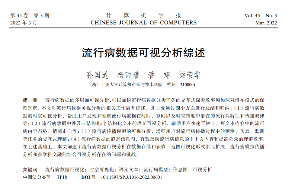 流行病数据的多层面可视分析,可以加快流行病数据分析任务的交互式探索效率和加深对潜在模式的深 刻理解. 本文对流行病数据可视分析的相关工作展开综述,并主要通过四个方面进行总结和归纳:(1)流行病数 据的时空可视分析,帮助用户发现和理解流行病数据在时间、空间以及时空维度中潜在的流行病特征和传播规律 等;(2)流行病数据中涉及非结构化/半结构化文本的语义可视分析,辅助用户快速了解长、短文本内容中的流行 病内容态势、情感走向等;(3)流行病传播模型的可视分析,增强用户对流行病传播过程中的预测、仿真、监测 等任务的交互式理解;(4)流行病数据的静态信息图,直观反映流行病信息的上下文内容和提高公众的理解效率. 在上述基础上,本文阐述了流行病数据可视分析在数据存储和获取,地图可视化形式多元扩展,流行病模拟传播 分析和多学科交融的综合可视分析存在的问题和挑战.