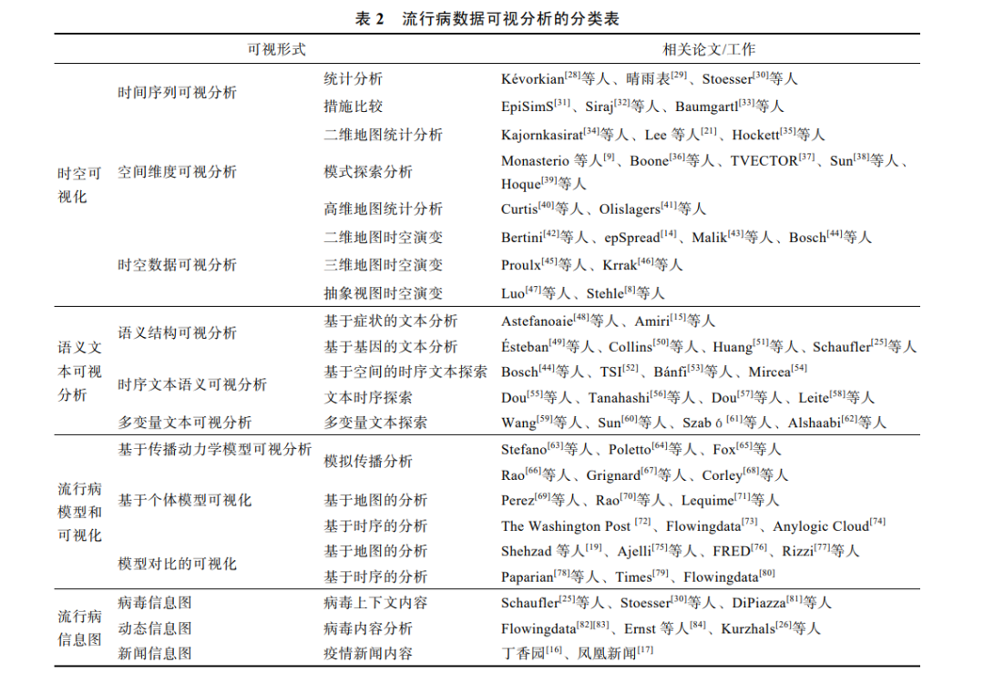 (4)信息图可视分析,该分析任务所要分析的内容 较少,基于直观的内容可视展现来解释数据. 因此, 根据不同的分析任务,应用不同的可视化形式,能 对流行病数据有更好地可视展现. 上述四类可视分 析任务中,虽然存在了一定的任务重叠以及可视形 式重叠,但其侧重点不同. 因此本文根据其研究的 主要内容以及所使用的流行病数据来源进行分类.