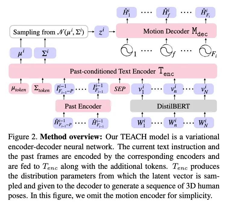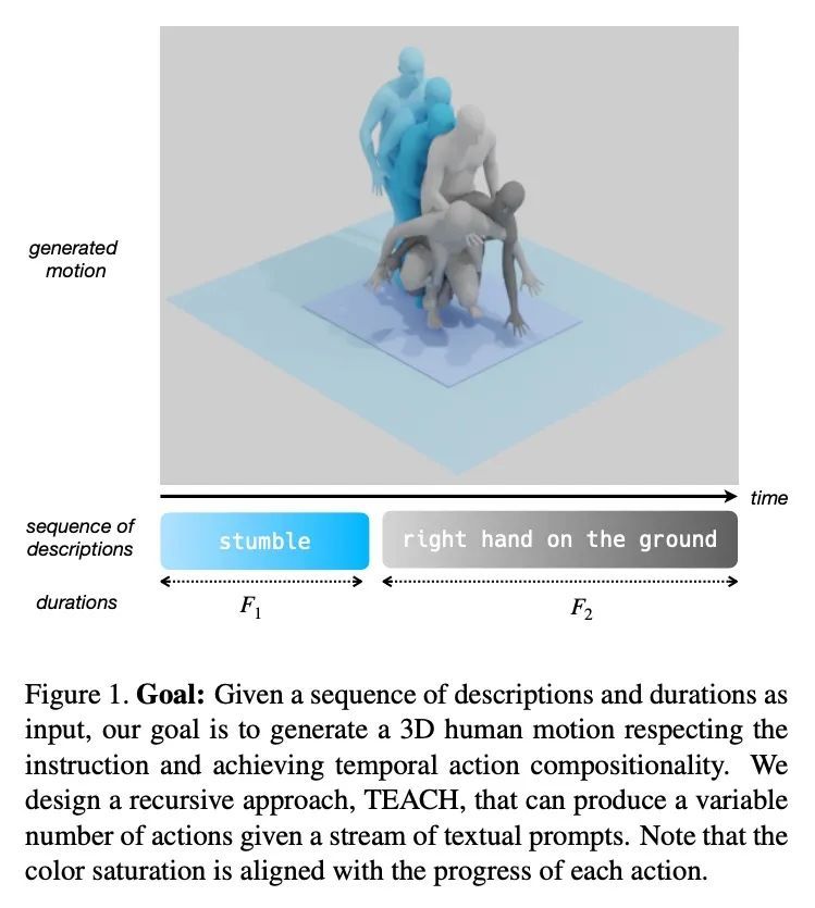 TEACH:3D人体时间动作合成。给定一系列自然语言描述,本文的任务是生成3D人体动作,这些动作在语义上与文本对应,并遵循指令的时间顺序,其目标是实现一系列动作的合成,称为时间动作合成。目前,以文本为条件的动作合成技术只将单个动作或单个句子作为输入。这部分是由于缺乏合适的包含动作序列的训练数据,但也是由于其非自回归模型表述的计算复杂性,不能很好地扩展到长序列。本文解决了这两个问题。首先利用最近的BABEL动作文本集,其有广泛的标记动作,其中许多是在一个序列中出现的,并在它们之间有过渡。本文设计了一种基于Transformer的方法,在一个动作内非自动渐进操作,但在动作序列内是自动渐进的。与多个基线对比的实验表明,这种分层的表述是有效的。