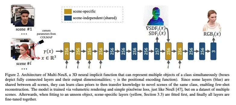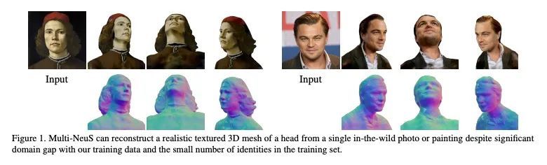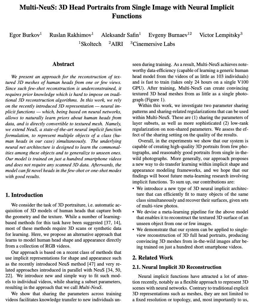 Multi-NeuS:基于神经隐函数从单一图像中获得3D头部肖像。本文提出一种从一个或几个视图中重建具有纹理的人体头部3D网格的方法。由于这种少样本照片重建是受限的,需要先验知识,而这是很难强加给传统的3D重建算法的。本文依靠最近提出的3D表示法——神经隐函数,基于神经网络,可以自然地从数据中学习关于人体头部的先验知识,并可直接转换为纹理网格。本文扩展了NeuS,一个最先进的神经隐含函数表述,以同时表示一个类别的多个目标(在本文中是人体头部)。底层的神经网结构被设计为学习这些目标之间的共性,并对未见过的目标进行泛化。所提出模型只需在100个智能手机视频上进行训练,不需要任何扫描的3D数据,可以在少样本或单样本模式下自适应新的头部,并取得良好的效果。